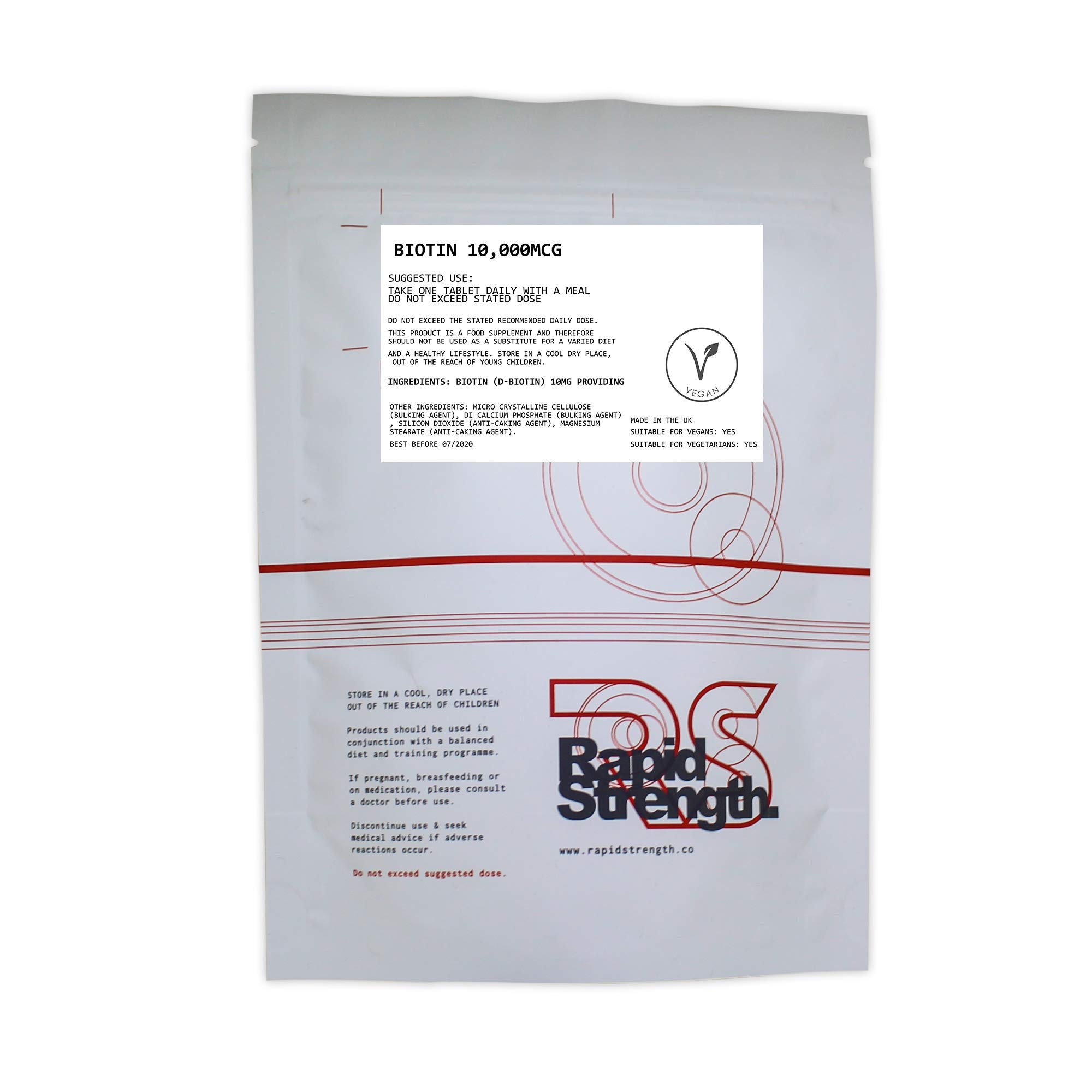 Biotin Tablets can help the health of your hair, radiance of your skin and strength of your nails with natural Biotin. an important B Vitamin that has long been known as a key element in maintaining healthy hair, skin and nails. The benefits include: supports metabolism helps convert food into energy Suitable for Vegetarians: YES Suitable for Vegans: YES Suggested Use As a dietary supplement, take one caplets daily, preferably with a meal, or as directed by your health care professional. Ingredients Biotin (D-Biotin) 10mg providing 10,000µg