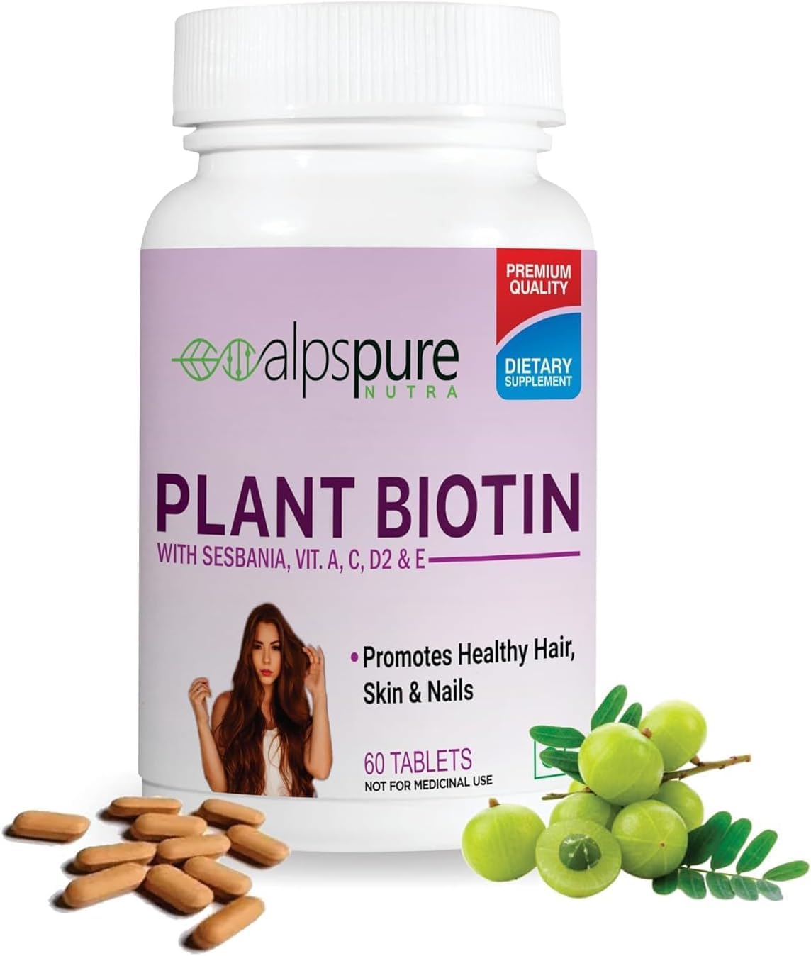 Supports Tissue Rebuilding: Alpspure nutra Plant biotin helps to rebuild the damaged tissues and improve health. Provides vital nutrients for the body: our body needs certain amount of nutrients and minerals which we sometimes do not get from our diet. Biotin provides us with the needed nutrients and promotes healthy hair, nails and skin. Strengthens Nails:Plant Biotin helps increase the thickness of nails and promotes healthy growth. Improves Skin Health: Our Plant biotin contains all the necessary vitamins and minerals and herbal extract which are needed to improve and maintain healthy skin tissues, giving it a glow and making your skin smooth and radiant. Promotes Thick Hair: Alps pure nutra's Plant biotin Tablets facilitates growth of thick and shiny hair. It is perfect for bringing dull and damaged hair back to life.