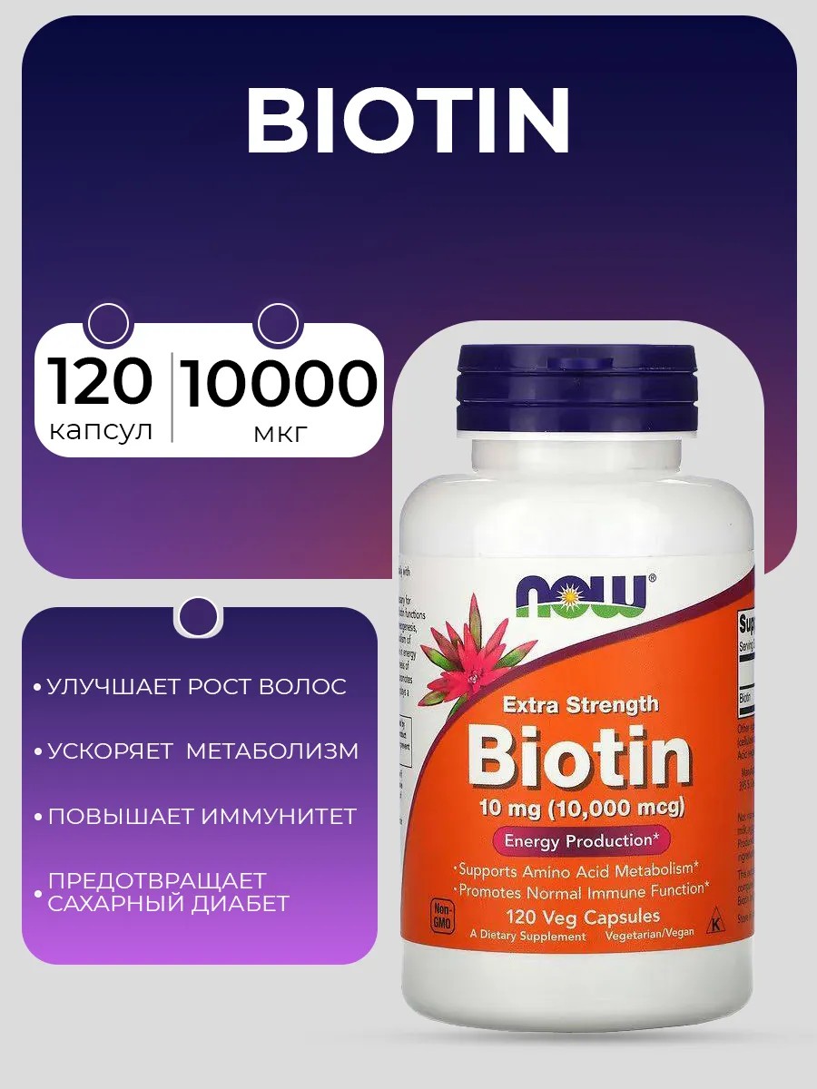 Biotin (Vitamin B7) 10,000 mcg, NOW, 120 capsules, for hair, skin, metabolism, energy. BENEFITS: - normalizes metabolism; - noticeable hair growth; - beneficial effect on the cardiovascular system; - optimizes the digestive system; - accelerated tissue regeneration. Biotin is a water-soluble vitamin, which is also called vitamin B7 or vitamin H. In the human body, biotin is synthesized by intestinal microflora, so taking antibiotics or gastrointestinal disorders can reduce its natural production. Biotin also plays a significant role in carbohydrate metabolism and helps provide the body's cells with energy, participates in the synthesis of fatty acids, improves the production and absorption of certain proteins, and supports amino acid metabolism. Biotin is also important for the health of connective tissues. It makes the skin more elastic and hydrated, nails - strong and shiny, and also regulates the secretion of the sebaceous glands and prevents hair loss. Taking a Biotin dietary supplement meets your daily biotin requirement and has a positive effect on your immune system and overall well-being. DIRECTIONS: Take 1 capsule daily with food. STORAGE: Store in a cool, dry, dark place out of reach of children. Avoid exposure to heat and sunlight. Use before the expiration date recommended by the manufacturer on the packaging. WARNING: Consult a healthcare professional before using dietary supplements if you are pregnant, breastfeeding, have a chronic medical condition, are elderly, under 18 years of age, taking prescription medications, or have a medical condition diagnosed by a physician.