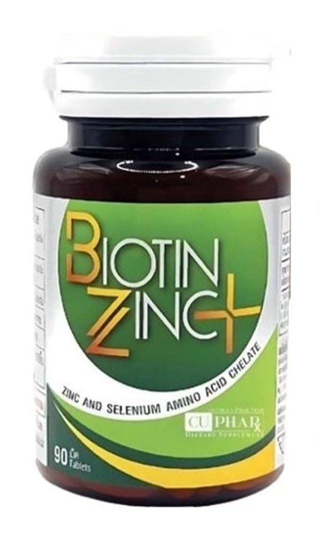 Supplement for hair and nails, Zinc Amino Chelate mixed with Biotin from the Faculty of Pharmacy, Chulalongkorn University Zinc is an important element in the hair growth process. Zinc deficiency Results in abnormal hair growth In 1 tablet, it contains - Zinc Amino Chelate (20 ) 75 mg. equivalent to Zinc 15 mg. - D-Biotin 150 mg. equivalent to Biotin 150 mcg. - Selenium 70 mcg