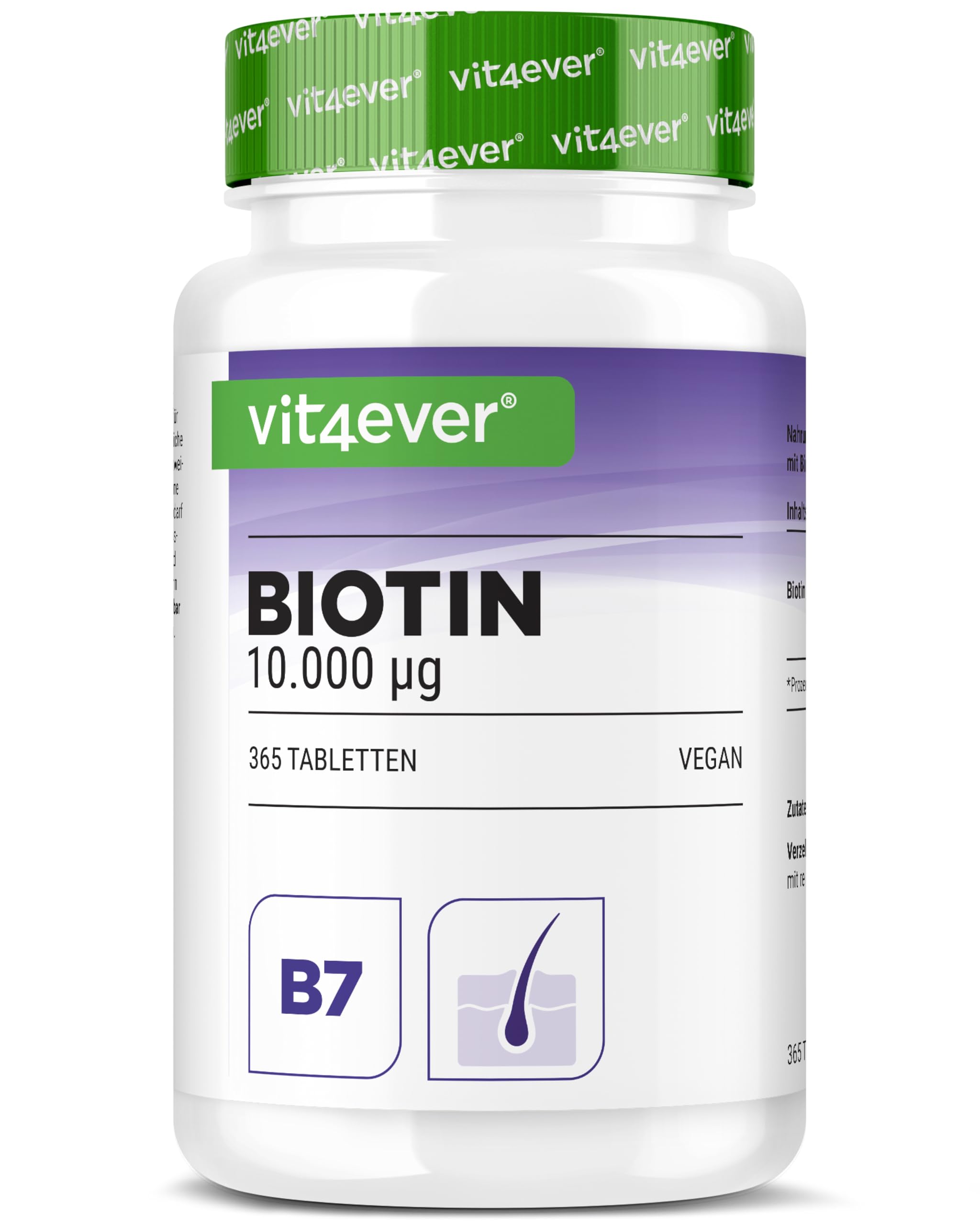 VIT4EVER QUALITY: The vit4ever range offers a wide selection of food supplements tailored to different needs. Our products are made from high-quality raw materials and produced exclusively at carefully selected European sites to guarantee consistently high quality. vit4ever – German quality since 2016. OUR PHILOSOPHY: We believe that true quality begins with care. That's why we develop our products using responsible manufacturing processes and carefully selected ingredients. Every Vit4ever product embodies transparency, trust, and sustainability – reliable support every day. CLEAR INGREDIENTS: Every ingredient we use is listed directly on the label – we prioritize complete transparency. Our biotin tablets are made exclusively from plant-based ingredients, are 100 vegan, and contain no unnecessary additives. They are free of PEGs, carrageenan, artificial flavors, and magnesium stearate. FOR DAILY ROUTINE: Our tablets contain pure D-biotin, the biologically active form of biotin, preferred in high-quality food supplements – ideal for simple and convenient daily supplementation. Biotin contributes to the maintenance of normal hair and skin, as well as normal energy-yielding metabolism. HIGH DOSE ANNUAL SUPPLY: Each tablet contains 10,000 µg (10 mg) of biotin – a high dose in a convenient tablet form, and with 365 tablets, ideal as an annual supply (just one tablet per day).QUALITÉ VIT4EVER : La gamme vit4ever propose un large choix de compléments alimentaires adaptés à différents besoins. Nos produits sont fabriqués à partir de matières premières de haute qualité et produits exclusivement dans des sites européens soigneusement sélectionnés afin de garantir une qualité constante et élevée. vit4ever - Qualité allemande depuis 2016. NOTRE PHILOSOPHIE: Nous croyons que la véritable qualité commence par le soin. C'est pourquoi nous développons nos produits à travers des processus de fabrication responsables et des ingrédients soigneusement sélectionnés. Chaque produit Vit4ever incarne transparence, confiance et durabilité – un soutien fiable au quotidien. INGRÉDIENTS CLAIRS : Chaque ingrédient que nous utilisons est indiqué directement sur l'étiquette – nous privilégions une transparence totale. Nos comprimés de biotine sont exclusivement à base d'ingrédients d'origine végétale, sont 100 véganes et ne contiennent aucun additif inutile. Ils ne renferment ni PEG, ni carraghénane, ni arômes artificiels, ni stéarate de magnésium. POUR LA ROUTINE QUOTIDIENNE : Nos comprimés contiennent de la D-biotine pure, la forme biologiquement active de la biotine, privilégiée dans les compléments alimentaires de haute qualité – idéale pour une complémentation quotidienne simple et pratique. La biotine contribue au maintien de cheveux normaux et d'une peau normale, ainsi qu'à un métabolisme énergétique normal. HAUTEMENT DOSÉ RÉSERVE ANNUELLE : Chaque comprimé contient 10 000 µg (10 mg) de biotine par comprimé – hautement dosé sous une forme pratique de comprimés et, avec 365 comprimés, idéal comme réserve annuelle (un seul comprimé par jour).Biotine - 10 000 mcg - 365 Comprimés - Haute Biodisponibilité : D-Biotine pour la Peau, les Cheveux et les Ongles - Sans additifs indésirables, Hautement Dosée, Végane