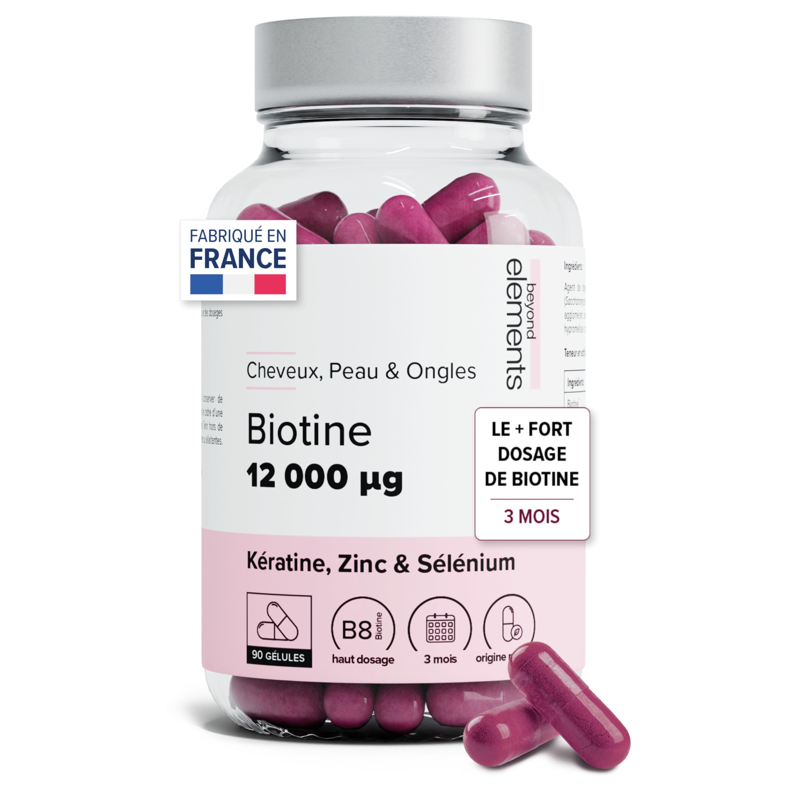 Biotine 12 000 g Haut Dosage Avec Keratine Selenium & Zinc - Pousse Cheveux Peau & Ongles - Cure 3 Mois - 90 G lules V g tales - Beyond Elements