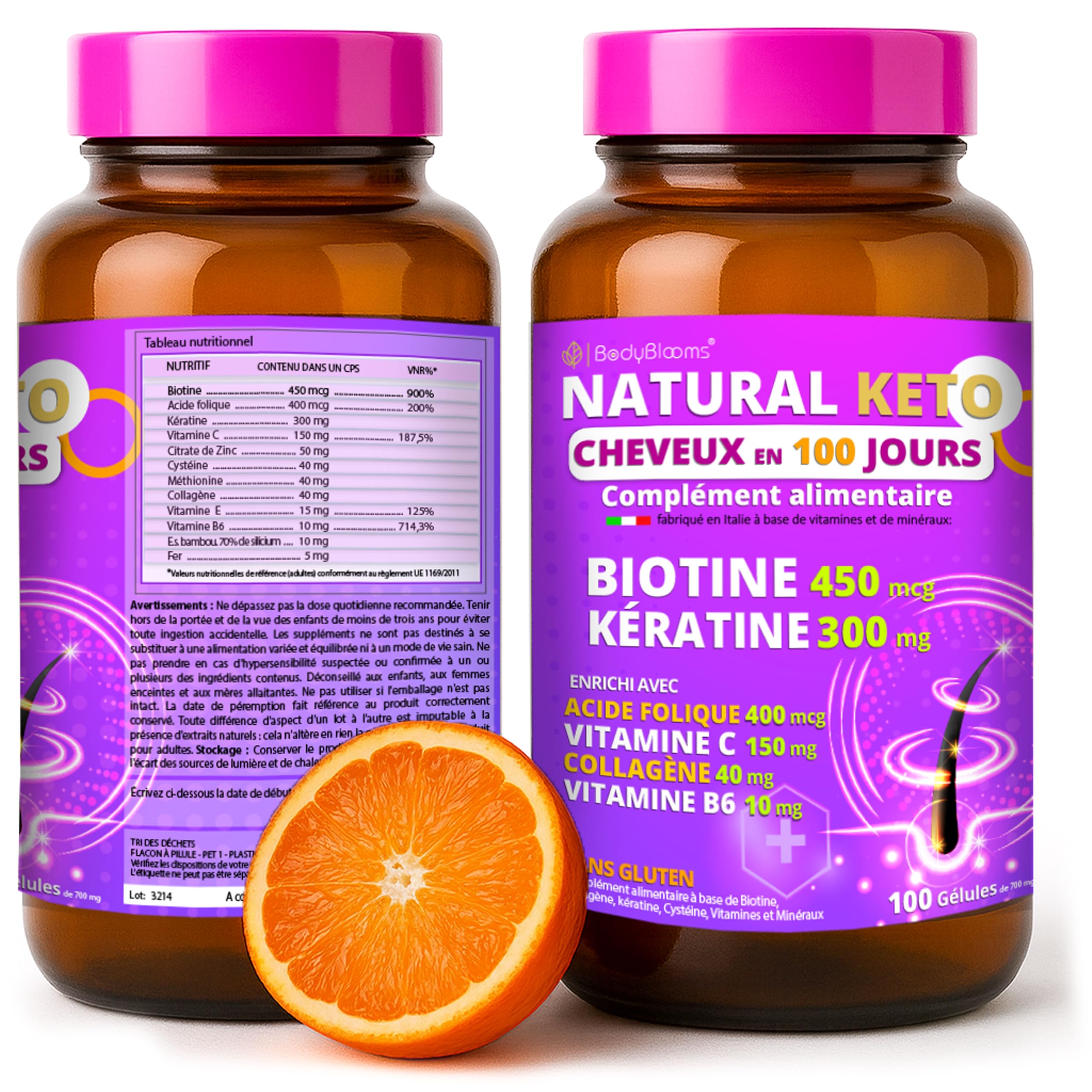 ? CHUTE CHEVEUX : Lisez les ingrédients utilisés sur la page produit et vous vous rendrez compte que chaque vitamine a une fonction spécifique dans le rôle des cheveux. En fait, chaque ingrédient est ciblé pour repousse cheveux homme , repousse cheveux femme. Notre produit est dénommé : pousse des cheveux très rapide, chute de cheveux homme femme, vitamine pour cheveux, gélules cheveux, pousse des cheveux,vitamine cheveux et pousse et complement cheveux. ?QUALITÉ ET NON QUANTITÉ: 100 gelules cheveux ils sont contenus dans une bouteille. Vous n'aurez qu'à prendre une gélule par jour pendant 100 jours. Chaque vitamine a un objectif spécifique: réduire la chute cheveux femme et homme et accélérer leur croissance.Une de nos gélules est un concentré de bien-être pour vos cheveux que vous remarquerez vous-même dès le premier mois de prise. Ils sont complement alimentaire fer, kératine, acide folique et le collagène. ? CROISSANCE DES CHEVEUX ET DES ONGLES: Les principes actifs sont également délibérément conçus pour les ongles et la peau. La formule puissante favorise 3 types de compléments enfermés dans 1 capsule (pousse de cheveux tres rapide et ongles, chute cheveux, repousse cheveux homme et femme). Des ingrédients connus et équilibrés tels que la biotine, la kératine, le collagène, la vitamine C et le zinc stimulent la croissance des cheveux et des ongles, favorisant une peau plus lisse. ? CHUTE DE CHEVEUX FEMME ET HOMME: La biotine cheveux et la kératine rendent les cheveux plus forts et résistants à la casse. La kératine, l'acide folique et le collagène pour les cheveux renforcent la structure, réduisent l'amincissement et perte de cheveux. Les vitamines C et E protègent les cheveux plus brillants et plus vitaux. Notre vitamine cheveux son parfait comme chute de cheveux homme et femme (gelules cheveux facilement avalable). ? 12 VITAMINES CHEVEUX: Natural Keto «Cheveux en 100 jours» est un complément alimentaire cheveux complet aux vitamines B, C et E formulé pour la pousse de cheveux, cure cheveux,perte de cheveux femme et homme et protection. Il est composé de vitamines et de minéraux spécifiques aux cheveux comme la biotine,Kératine,collagène,fer,acide folique,zinc,vitamine C,vitamine B6,silicium,vitamine E,méthionine et cystéine.C'est un complement alimentaire peau, les cheveux et les ongles.