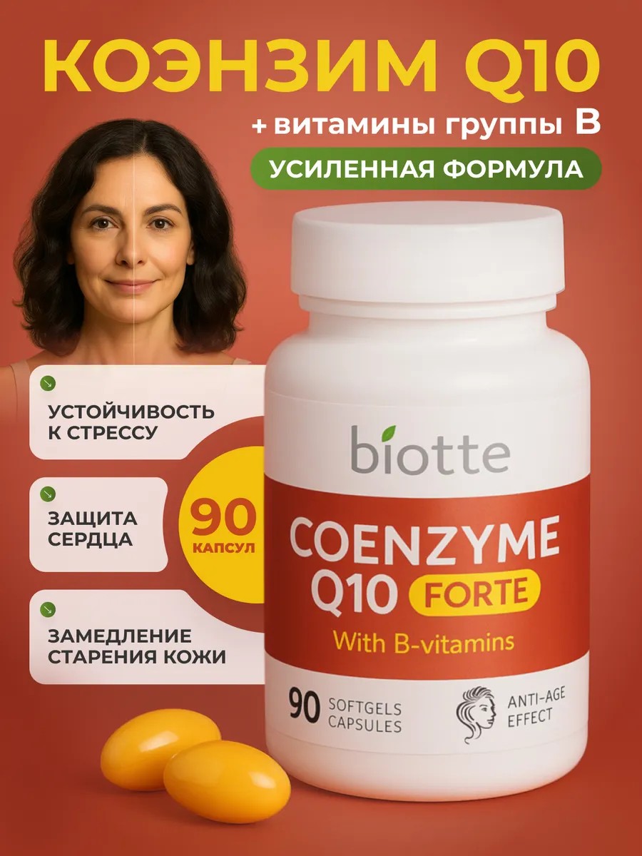 Уникальный антивозрастной комплекс витаминов коэнзим q10 убихинон капсулы Biotte - это качественные витамины и бады для женщин, мужчин 30-40-50 лет и пожилых в возрасте после 60, которые хотят продлить свою молодость и здоровье. Пищевые добавки q10 коэнзим участвуют в процессе создания АТФ – основной молекулы, которая обеспечивает энергетический потенциал для биохимических реакций в организме. С возрастом уровень кофермента коэнзим ку 10 в организме снижается, поэтому необходимо постоянно пополнять, особенно взрослым после 30.