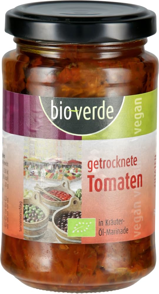 Processing: The tomatoes are marinated and cured with high-quality oil and fresh herbs. 200g jars are available in the dried product range. Certified organic in the EU. INGREDIENTS Sun-dried tomatoes: 55 , sunflower oil, olive oil, industrial wine vinegar, basil 1 , sea salt, oregano USAGE INSTRUCTIONS Bio-Verde tomatoes are ideal for enhancing salads, Mediterranean dishes, or antipasti platters. See more