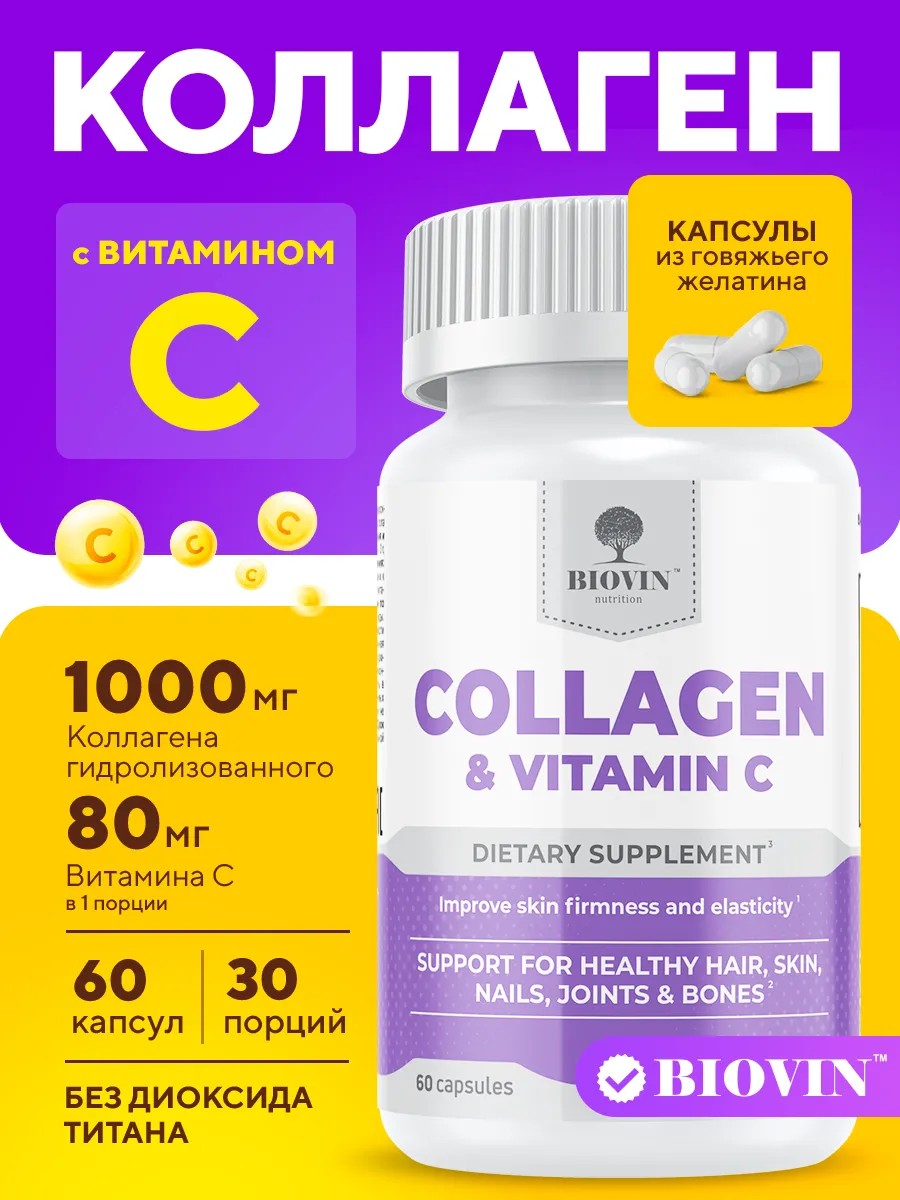 BIOVIN Коллаген капсулы,collagen, Бад для волос и кожи лица 60капс