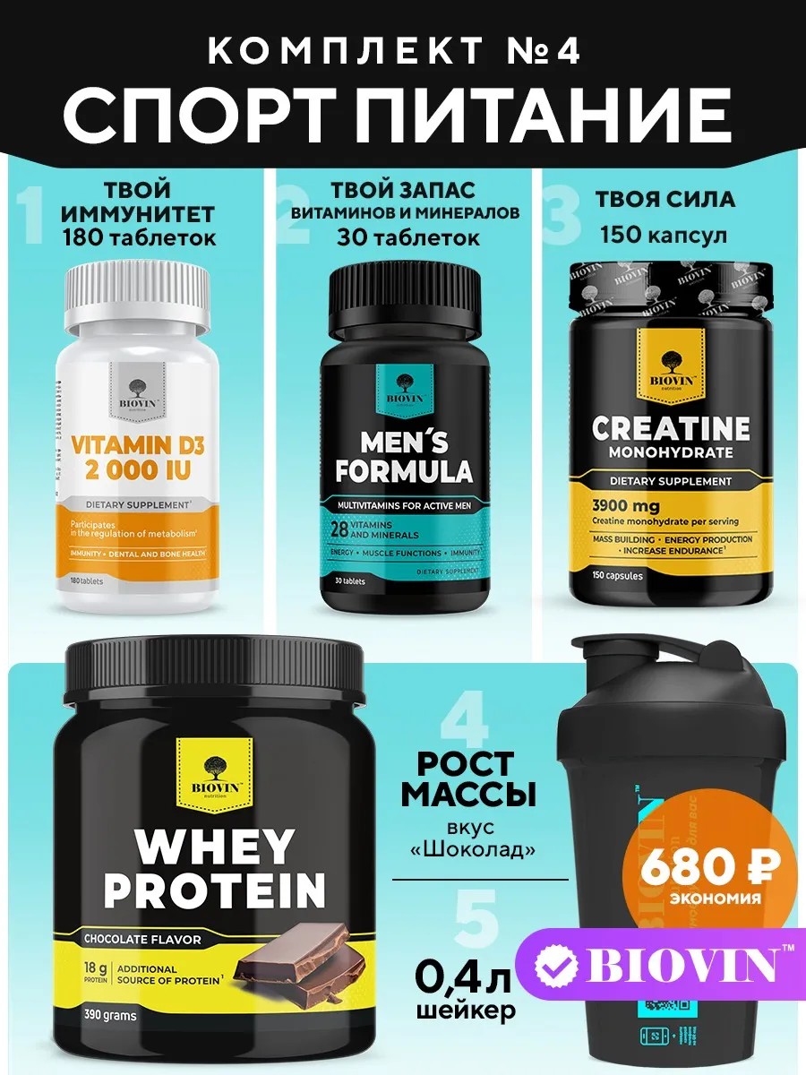 BIOVIN №4 спортивное питание Д3, витамины, креатин, протеин,шейкер