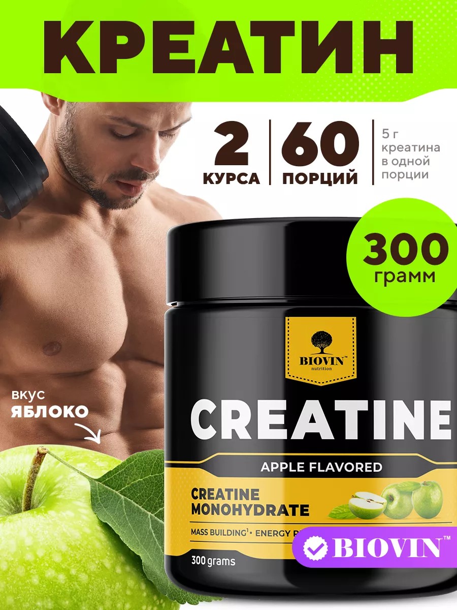CREATINE Биовин 300 г. порошок "вкус Яблоко" - это наиболее эффективная и популярная форма креатина, используемая атлетами для увеличения мышечной массы, силы и выносливости, повышения эффективности физических нагрузок. Креатин моногидрат улучшает энергетический потенциал мышц. Натуральный вкус яблоко. Мерная ложка внутри на дне банки. Аминокислота creatine monohydrate увеличивает рост сухой мышечной массы, улучшает рельеф мышц. Изготовлен без использования добавок, ароматизаторов, сахара или подсластителей. Креатин порошок в форме биодобавки сначала попадает в кровь, а затем в клетки мышц. В такой форме он повышает выносливость мускулатуры на фоне относительно непродолжительных, но очень интенсивных нагрузок.