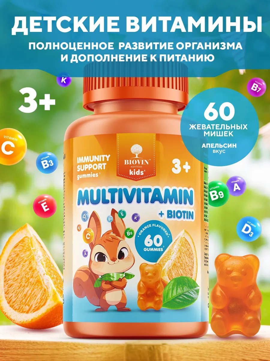 60 chewable gummies. Biovin multivitamins in chewable form support children's health.