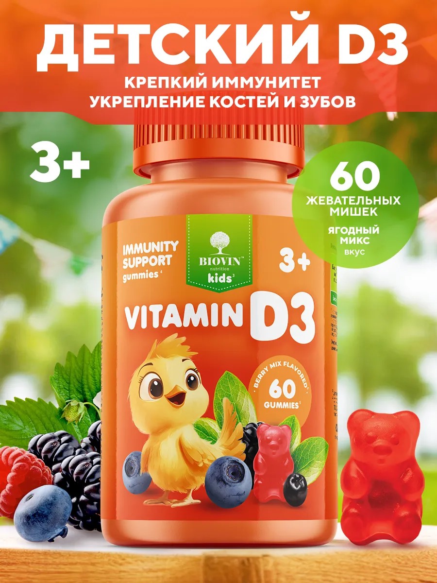60 жевательных мармеладок. Детские Д3 600 МЕ в 1 пастилке. Мультивитамины Биовин в форме жевательных пластинок поддерживают здоровье ребенка. Вкусные мягкие витамишки со вкусом фруктов и ягод имеют в составе натуральные витамины и минералы необходимые в период активного роста и развития организма. Поливитамины (натуральные витаминные комплексы) имеют сбалансированное соотношение витамин для поддержания здоровья, роста тела, крепкой нервной системы, зрения, памяти, укрепления иммунитета, развития мозга, укрепления зубов, нормализации сна и выравнивания эмоционального фона. Жевательные мармеладные минералы, бады для подростков и малышей помогут позаботиться о здоровье в период простудных заболеваний, при несбалансированном питании, во время умственных и физических нагрузок, при адаптации ребенка в новых условиях, на фоне ежедневного стресса. Вкусные мягкие витамишки со вкусом фруктов и ягод. Детские витамины в жидкой форме и в капсулах.