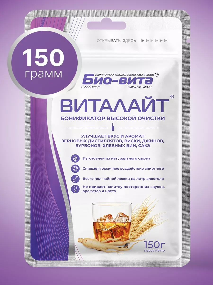 Бонификатор Виталайт - это комплексная пищевая добавка для использования в качестве сырья в пищевой промышленности с целью умягчения и улучшения вкуса ликероводочных изделий и защиты организма от интоксикации. Облегчает протекание печеночной интоксикации и снижает остроту похмельного синдрома. Благодаря входящим в состав компонентам Виталайт улучшает вкус алкогольных напитков и подавляет токсичные метаболиты и вредные ферменты, снижая негативное влияние алкоголя. Не уменьшает крепость, не меняет цвет и не придаёт напиткам никаких посторонних вкусов или запахов. Рекомендуемая дозировка: 3-7гр на литр алкогольного напитка. Перед внесением добавки в напиток рекомендуется растворить её в тёплой чистой воде (не выше 40 градусов Цельсия) в соотношении примерно 1к10. Затем раствор влить в готовый напиток. Напиток готов к употреблению сразу после внесения и растворения добавки. Био-Вита