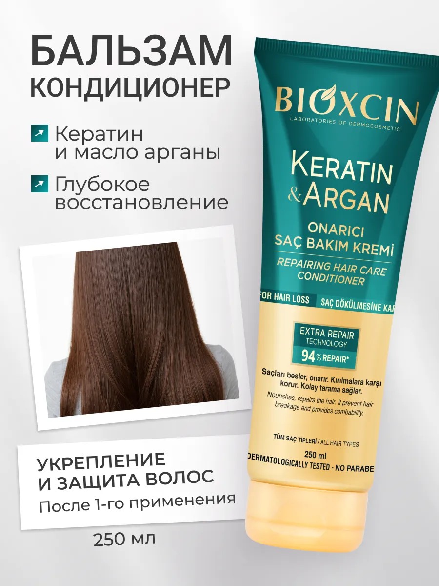 Надежный спутник ухода за волосами – увлажняющий бальзам-ополаскиватель с кератином и аргановым маслом от Bioxcin! Наш профессиональный бальзам питает, восстанавливает и увлажняет их, возвращая им здоровый вид. В составе продукта гидролизованный кератин, который заполняет все пустоты, вызванные повреждениями и приклеивает отслоившиеся чешуйки к стволу во-лоса, делая его гладким и блестящим. Аргановое масло, в свою очередь, питает и восстанавливает утраченную влагу, делая мягкими, блестящими и шелковистыми. Наш баллончик с эффективным термозащитным действием предотвращает истончение, сечение и ломкость. Вы можете быть уверены в безопасности ваших прядей – они будут защищены от вредных воздействий термоинструментов. Кондиционер-ополаскиватель Bioxcin – универсальное средство! Он подходит для всех типов волос: ослабленных, жирных, тонких, ломких, поврежденных, окрашенных, кудрявых и даже для блонд. Маска для восстановления также не ограничена полом или возрастом – она подходит и для мужчин и для женщин, а также для подростков старше 14 лет. Мы гордимся тем, что наша продукция – это 100% оригинальная натуральная уходовая косметика. Мы самостоятельно привозим ее непосредственно с завода в Турции. Не бойтесь подделок и некачественных товаров вы можете быть уверены в их оригинальности и высоком качестве. Для более глубокого восстановления рекомендуем использовать вместе с сывороткой и шампунем Биоксин. Уход за шевелюрой – это не только необходимость, но и приятное занятие, которое может стать отличным подарком на любой праздник. Применение бальзама – простое и удобное. Нанесите его на влажные, вымытые пряди и равномерно распределите по всей длине массирующими движениями. После чего, тщательно смойте. Чтобы достичь глубокого восстановления, оставьте средство на 3-5 минут. Попробуйте наш кондиционер и убедитесь сами, что вам действительно нужен такой уход! Так что, не медлите – заказывайте уже сейчас! Порадуйте себя и сделайте их здоровыми, сияющими и ухоженными!