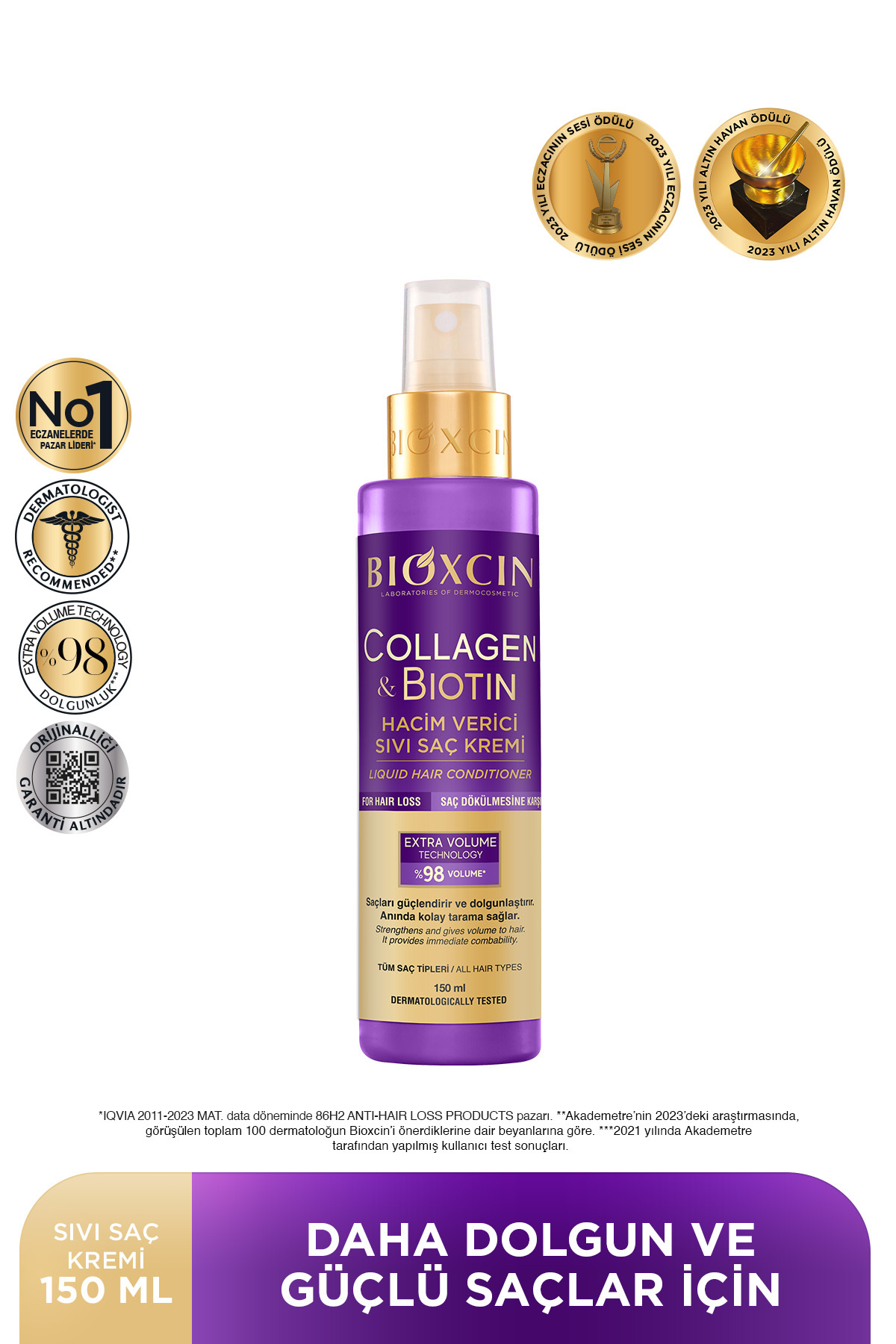 Bioxcin Collagen Biotin hacim verici saç serumu, ince telli, hacimsiz ve güçsüz saçlari içerigindeki hidrolize kolajen, biotin ve Bio-Activ Peptitler ile dolgunlastirir ve güçlendirir. Patentli BioComplex B11 ile engellemeye yardimci olur.