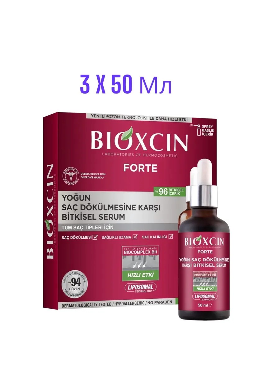 Концентрированная сыворотка Bioxcin Forte против интенсивного выпадения волос для женщин и мужчин. Это аптечная профессиональная лечебная косметика, которая решает проблемы выпадения волос, андрогенной и очаговой алопеции, повышенной жирности, себореи, себорейного дерматита, атопического дерматита, псориаза, перхоти, зуда, раздражения и сухости головы.\n\nЛечебная сыворотка содержит 8-кратную концентрацию активного компонента BioComplex B11, усиленную липосомальной технологией для быстрого проникновения в глубокие слои кожи. Активный ингредиент BioComplex B11 предотвращает выпадение, стимулирует рост, питает и укрепляет волосяные фолликулы, улучшает их структуру. Волосы становятся плотными, появляется здоровый блеск.\n\nСостав обогащен экстрактом виноградных косточек, ментолом и медом. Рекомендована для всех типов волос, ослабленных, тонких, ломких, поврежденных, окрашенных, кудрявых, для блонда, жирных, нормальных и сухих волос. Эффективна при различных формах выпадения, спровоцированных внутренними и внешними факторами, при сезонном выпадении или необходимости ускорить рост и улучшить состояние. Подходит для использования после трансплантации волос. Эффективность подтверждена лабораторными испытаниями и одобрена Министерством Здравоохранения Турции. Рекомендована врачами трихологами. 100% оригинал, поставляется напрямую с завода в Турции. Отличный подарок. В комплекте 3 сыворотки по 50 мл и спрей-дозатор. Рекомендуется использовать с шампунем Биоксин Форте. Рекомендовано дерматологами. Гипоаллергенно. Не содержит парабенов. Свежесть ментола.\n\n**Характеристики:**\n* Тип: Сыворотка для волос\n* Бьюти-ингредиент: Пантенол\n* Тип волос: Для всех типов волос\n* Особенности состава: Без парабенов\n* Пол: Женский/Мужской\n* Единиц в одном товаре: 3\n* Объем: 150 мл\n* Вес: 150 г\n* Страна-изготовитель: Турция