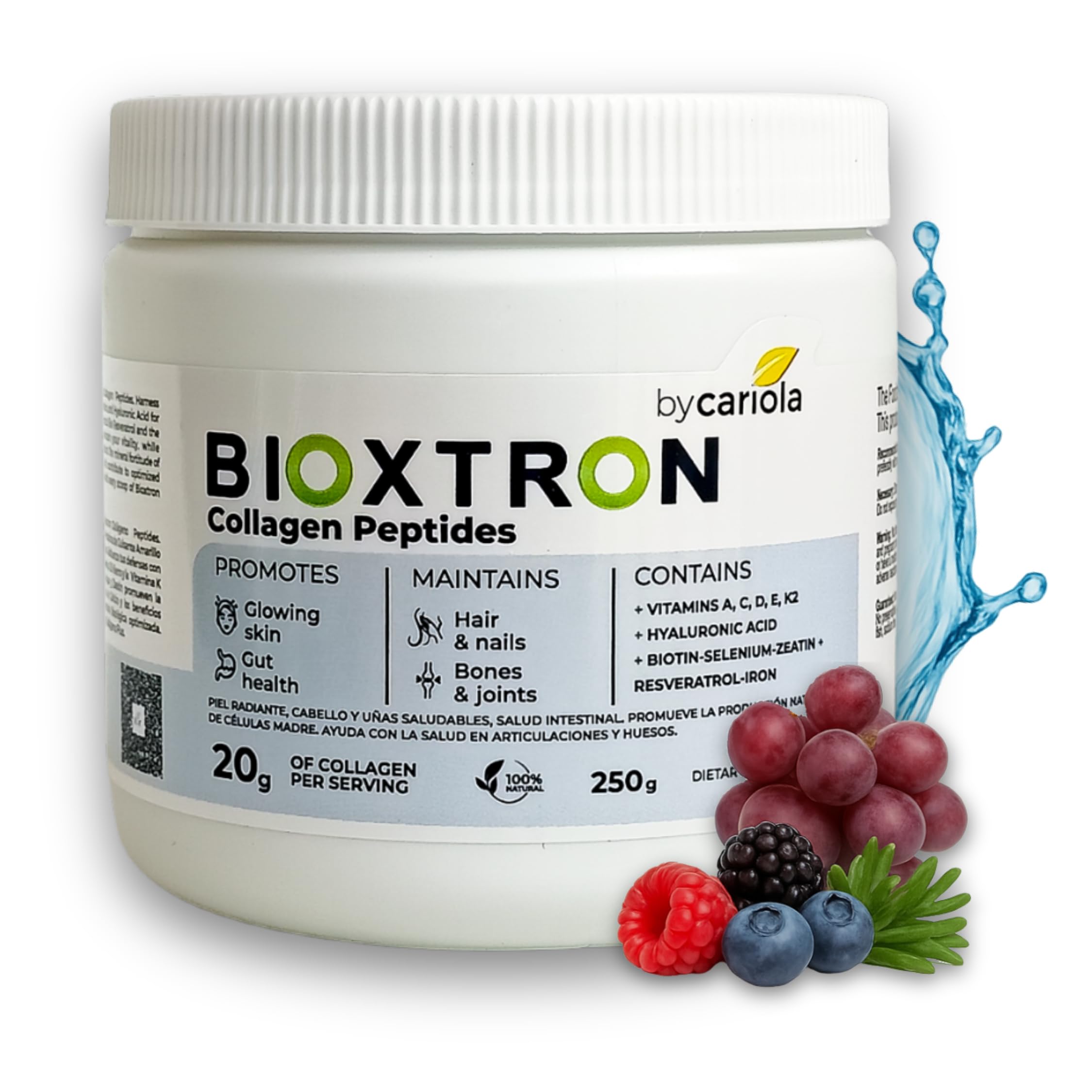 Beauty Starts Within—Support Skin, Strength, and Cell Vitality Bioxtron Collagen Peptides Powder offers more than surface-level beauty—it supports renewal from deep within. Formulated with hydrolyzed collagen peptides and advanced nutrients like Aphanizomenon flos-aquae (AFA) and spirulina, this hydrolyzed collagen peptides for women and stem cell supplement is designed to nourish the body at the cellular level. AFA extract, a freshwater botanical known for supporting natural stem cell activity, helps promote skin regeneration and full-body vitality. Each 20g serving of our unflavored collagen powder delivers premium Type I bovine collagen along with hyaluronic acid, biotin, and a carefully selected blend of vitamins A, C, D, E, and K2. These ingredients work together to help maintain smooth skin, healthy hair, strong nails, and flexible joints. Resveratrol and selenium provide added antioxidant support for graceful aging. Our collagen supplements for women and men is unflavored and easy to mix into your favorite drinks, Bioxtron makes it simple to integrate daily self-care into your wellness routine. Whether you're focused on aging beautifully or feeling your best, this collagen supplement formula is here to support your journey. Support your beauty, strength, and renewal—add Bioxtron Collagen Peptides Powder to your cart today.BACKED BY 20 YEARS OF FORMULATION EXPERTISE: Developed by By Cariola, Bioxtron Collagen Peptides Powder is the result of over two decades of supplement innovation. Our trusted formulas are crafted to help men and women feel more vibrant, resilient, and supported every day. MIXES EASILY INTO HOT OR COLD BEVERAGES: This unflavored collagen peptide powder dissolves cleanly into water, coffee, tea, smoothies, or shakes. No clumps, no aftertaste, and no added sugars—just easy daily support for your beauty and wellness goals. NUTRIENTS THAT ACTIVATE YOUR NATURAL GLOW: Infused with biotin, hyaluronic acid, resveratrol, and vitamins A, C, D, E, and K2, this collagen powder helps support hair growth, smoother skin, and daily energy through targeted beauty nutrition. TYPE I BOVINE COLLAGEN FOR BEAUTY AND MOBILITY: Our collagen protein powder for women, men, young adults, and seniors features high-quality bovine collagen peptides to help maintain skin elasticity, strong bones, and joint comfort. Type I collagen is essential for aging well at every stage. ADVANCED COLLAGEN FORMULA WITH STEM CELL SUPPORT: Bioxtron combines hydrolyzed collagen peptides with AFA extract and spirulina to promote cellular renewal. Designed to support skin rejuvenation, joint flexibility, and overall vitality from the inside out.