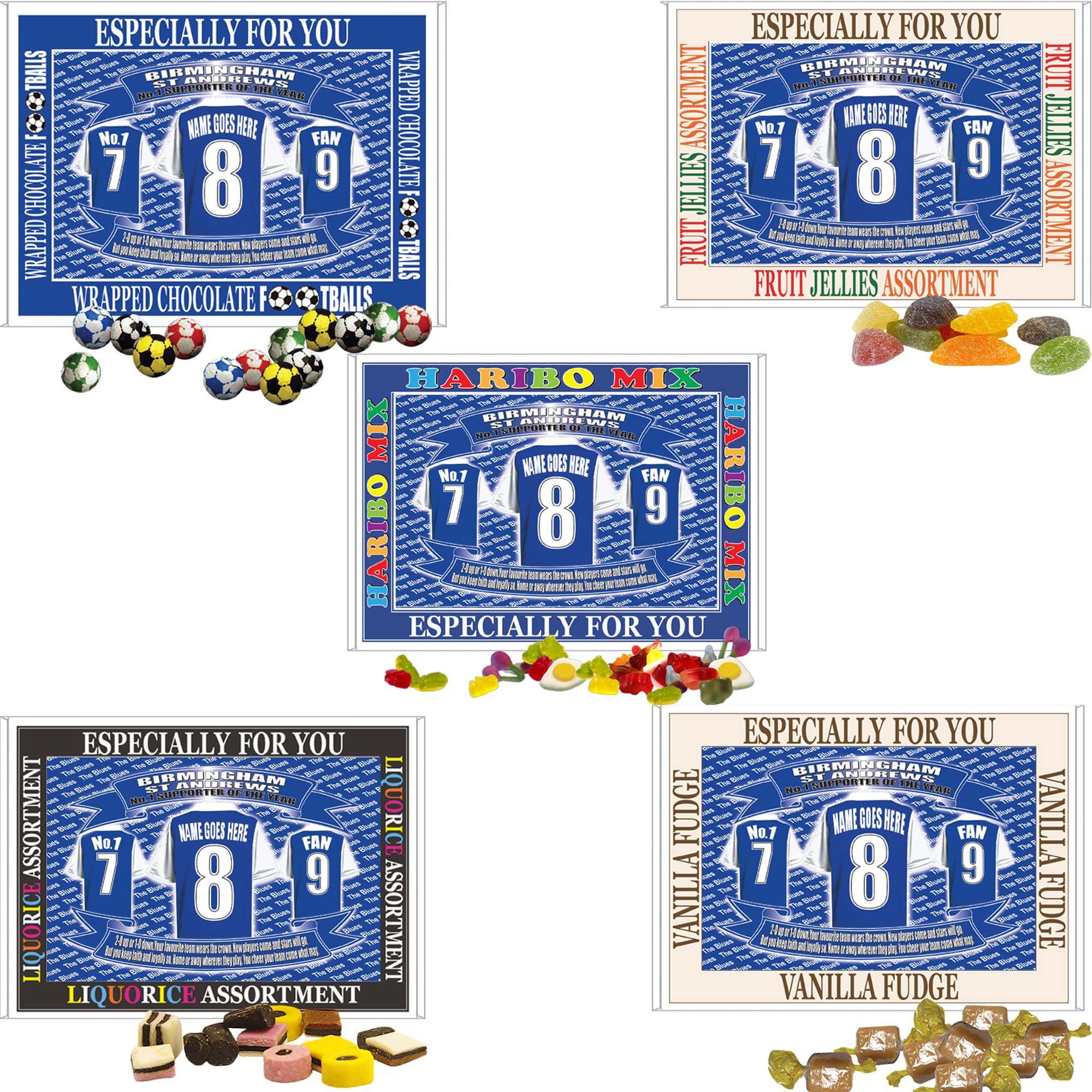 A perfect gift for any avid BIRMINGHAM SUPPORTER - A box of your favourite sweets with a name of your choice on your team's shirt. INGREDIENTS : LIQUORICE ASSORTMENT-- Sugar, treacle, wheat flower , glucose syrup, desiccated coconut, vegetable oil, beef gelatine, cornflower, humectant, glycerol, natural colours, plain caramel, beetroot red, curcumin, anthocyanins, capsanthin, fat-reduced cocoa powder, liquorice powder, flavourings, glazing agent. Fruit and vegetable concentrates: Blackurrant, carrot and radish. This product contains wheat FRUIT GUMMIES -- Sugar, Glucose syrup, dextrose, spirulina, starch, gelatine, acid, citric acid, palm fat, watergelatine, caramelised sugar syrup, flavouring fruit and plant concentrates apple, aronia, blackcurrant, elderberry, grape, kiwi, lemon, mango, nettle, orange, carrot, passion fruit, spinach glazing agents: beeswax carnauba wax, palm fat, water gelatine, colour: copper complexes to chlorophyll, invert sugar syrup elderberry extract, carob extract. May contain traces of animal ingredients, including milk FUDGE -- Sugar, glucose syrup, full cream condensed milk (milk sugar), vegetable oils (palm kernel palm stearin oil), butter (milk), salt, emulsifier: soya lecithin flavourings. This product may contain egg and nut traces FRUIT JELLIES -- Sugar, glucose syrup, water, gelling agent, pectin acid: lactic acid flavourings. Colours: Anthocyanins. Chlorophylls, curcumin, capsanthin. This product may contain nuts, milk, sesame seeds and gluten CHOCOLATE FOOTBALLS -- Sugar, vegetable oil (palm kernel), whey powder (milk), reduced fat cocoa powder, sorbitan tristearate, soya lecithin, natural bourbon vanilla. This product contains milk and soya . Any image or text displayed on this unofficial product has been independently produced and is in no way connected with, or endorsed by the personalities, people, agents or organisations they may appear to depict. INGREDIENTS Liquorice Assortment Sugar, treacle, wheat flower , glucose syrup, desiccated coconut, vegetable oil, beef gelatine, cornflower, humectant, glycerol, natural colours, plain caramel, beetroot red, curcumin, anthocyanins, capsanthin, fat-reduced cocoa powder, liquorice powder, flavourings, glazing agent. Fruit and vegetable concentrates: Blackurrant, carrot and radish. This product contains wheat. Vanilla Fudge Assortment Sugar, glucose syrup, full cream condensed milk (milk sugar), vegetable oils (palm kernel palm stearin oil), butter (milk), salt, emulsifier: soya lecithin flavourings. This product may contain egg and nut traces. Fruit Jellies Assortment Sugar, glucose syrup, water, gelling agent, pectin acid: lactic acid flavourings. Colours: Anthocyanins. Chlorophylls, curcumin, capsanthin. This product may contain nuts, milk, sesame seeds and gluten.Supporting UK Small Businesses. Manufactured in the UK. Perfect Gift for Any Occasion. Personalised with a Name of Your Choice. FREE Personalisation.