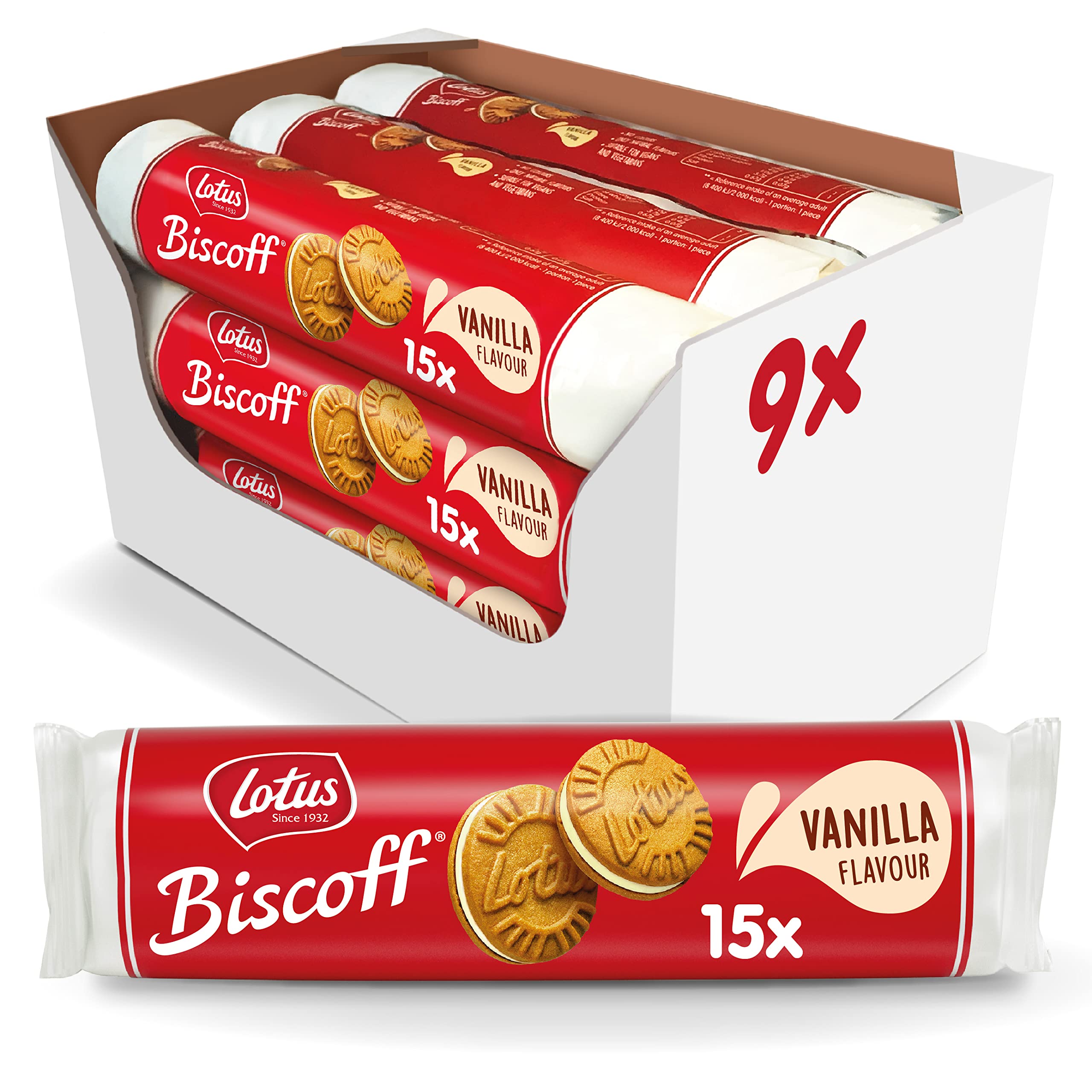 Biscoff biscuits have been a treat enjoyed for generations, captivating taste buds with their signature caramelized flavor. Whether enjoyed as a lunchbox snack, with a hot drink, or on the go, our biscuits are irresistibly delicious with two crispy Biscoff biscuits on either side of a smooth cream filling – the perfect alternative to custard or bourbon biscuits. Made with non-GMO ingredients, they are dairy-free and contain no artificial flavors or colors, making them a treat for everyone. INGREDIENTS Sugar, WHEAT flour, vegetable oils (palm , rapeseed), candy sugar syrup, raising agent (sodium carbonate), soy flour, emulsifier (lecithins (SOY)), salt, cinnamon, natural flavoring. Palm oil from sustainable and certified plantations. SAFETY WARNING May contain traces of milk See moreBiscoff - Biscuits sandwich fourrés à la crème vanille - 15 biscuits sandwich par paquet - Ingrédients d'origine naturelle - Végétalien - Sans colorants ni arômes ajoutés - 9 x 150 g - 1,35 kgDESCRIPTION DU PRODUIT DESCRIPTION DU PRODUIT Biscoff Les biscuits sont un régal apprécié depuis des générations, captivant les papilles gustatives avec leur saveur caramélisée signature. Qu'ils soient dégustés comme collation dans une boîte à déjeuner, accompagnés d'une boisson chaude ou dégustés en déplacement, nos biscuits sont irrésistiblement délicieux avec deux biscuits Biscoff croquants de chaque côté d'une garniture de crème lisse – l'alternative parfaite aux crèmes à la crème anglaise ou aux biscuits bourbon. Fabriqués avec des ingrédients sans OGM, ils sont exempts de produits laitiers et ne contiennent ni arômes ni colorants artificiels, ce qui permet à tout le monde de se faire plaisir. INGRÉDIENTS Sucre, farine de BLÉ, huiles végétales (palme , colza), sirop de sucre de bonbons, levant (carbonate de sodium), farine de soja, émulsifiant (lécithines (SOJA)), sel, cannelle, arôme naturel. Huile de palme provenant de plantations durables et certifiées. AVERTISSEMENT DE SÉCURITÉ Peut contenir des traces de lait Voir plus