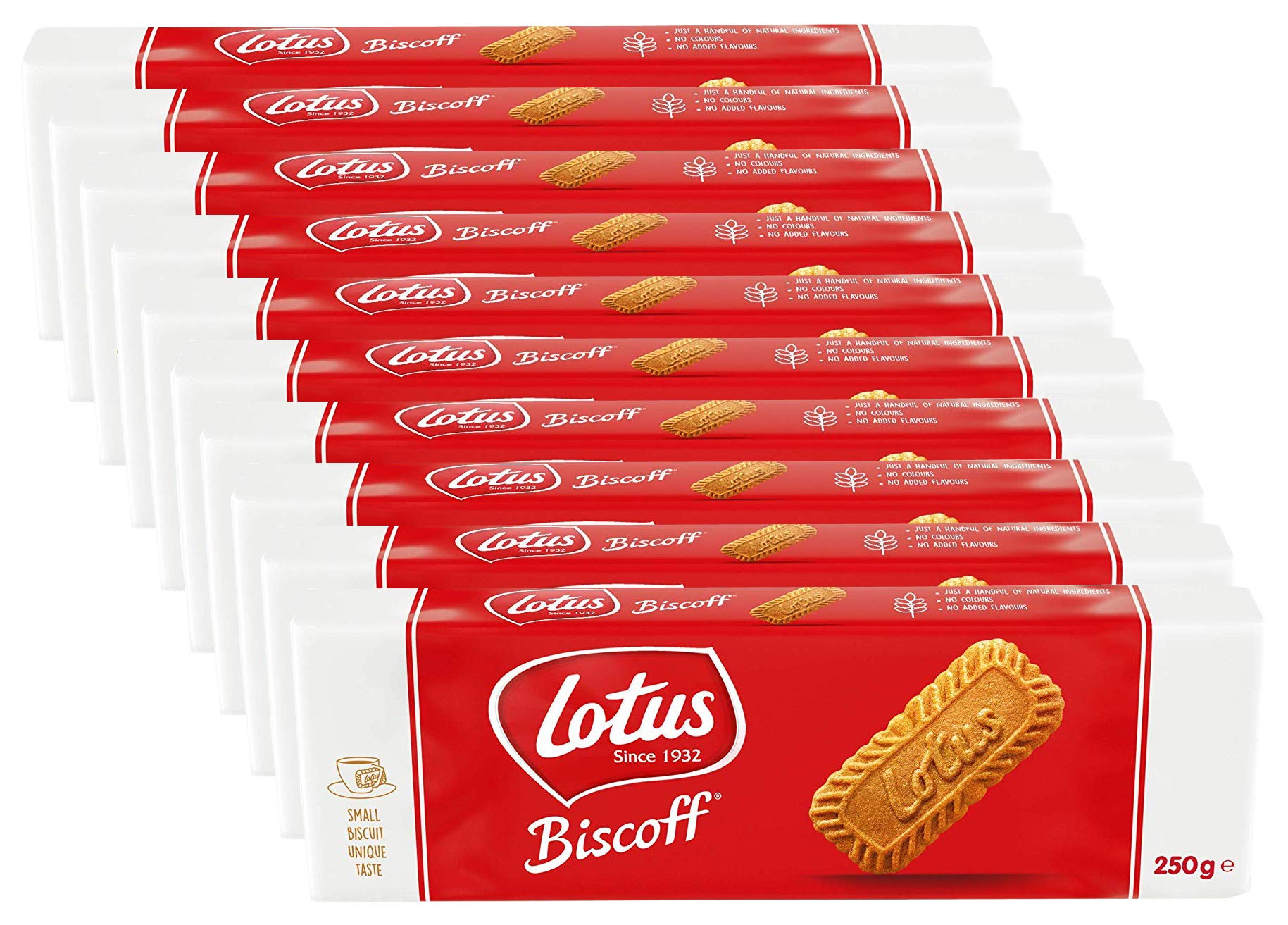 Lotus Biscoff biscuits are a type of shortbread biscuit known as "speculoos," a Belgian specialty popular throughout Europe. Their unique flavor comes from the caramelization of the sugar during the baking process. A touch of cinnamon and other spices adds a special touch. The box contains 10 boxes of 250g each, for a total of 2500g of Lotus biscuits. INGREDIENTS Wheat flour, sugars, vegetable oils (certified sustainable palm oil, rapeseed oil), candied syrup, raising agent (sodium bicarbonate), soy flour, salt, cinnamon.