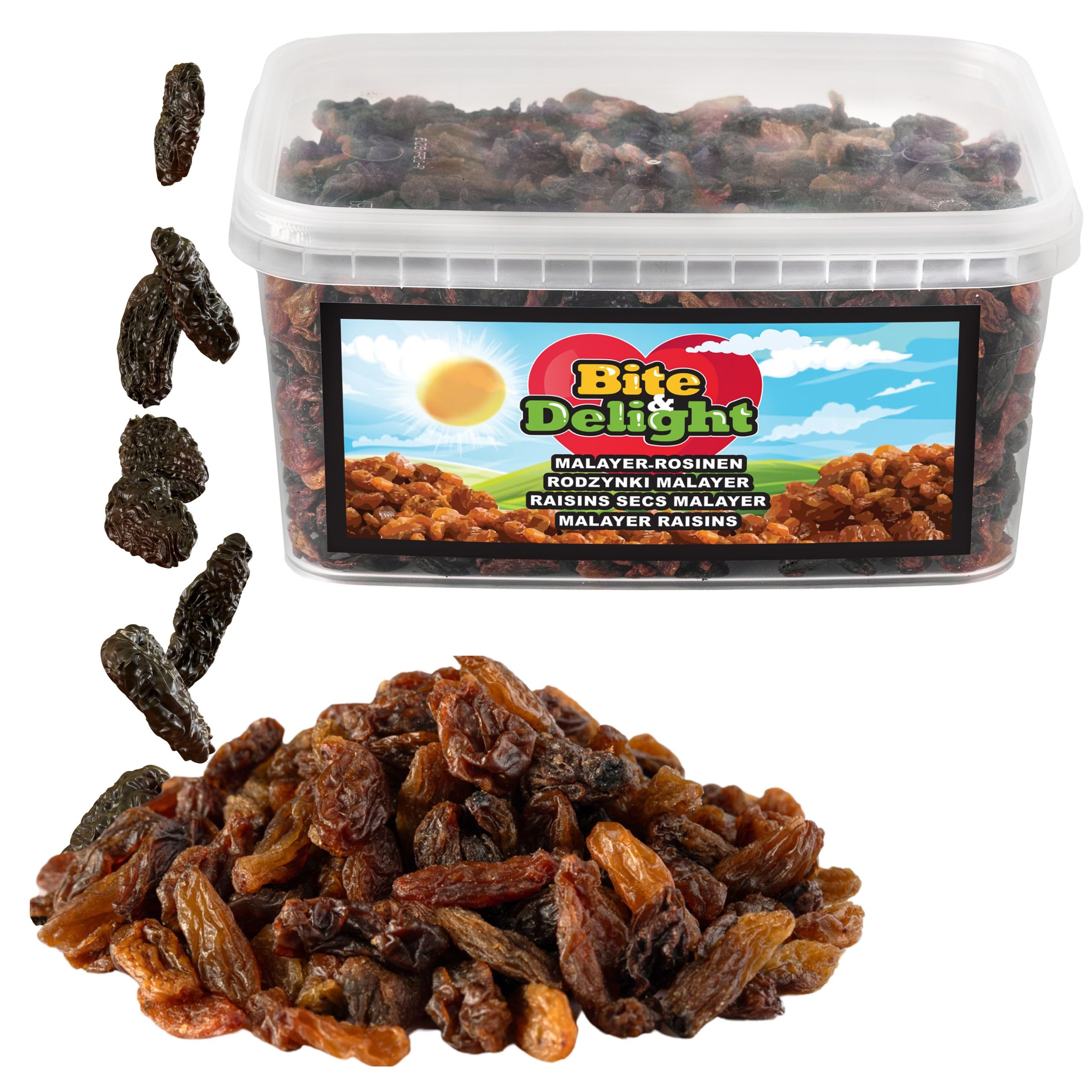 Bite Delight Dried Sultanas Malayer – Natural Raisins, No Additives, No Sugar, Sun-Dried, Vegan, and High in Fiber Special Features: Lactose-free, organic, kosher, unsulfured, low glycemic index, sweet, low in fat, keto-friendly, raw, superfood, vegan, vegetarian, high in fiber, high in protein. 1. Natural Sweetness: No added sugar, sun-dried for an intense and delicious flavor. 2. High in Fiber: Supports digestion and is perfect for a healthy diet. 3. No Preservatives: The natural drying process ensures high product quality and safety. Sultana Malayer raisins are distinguished by their intense caramelized sweetness and are a healthy alternative to traditional sweets. Rich in fiber, vitamins, and minerals, these raisins offer a delicious and nutritious snack. Nutritional values per 100g: Energy: 292 kcal 1222 kJ Fat: 0.8g, of which saturates: 0.3g Carbohydrate: 65g, of which sugars: 56g Fiber: 0g Protein: 1.8g Salt: 0.05g Storage: Store in a cool, dry place to maintain freshness. Uses: Desserts: Ideal for cakes, cookies, cereals, oatmeal, and other baked goods. Salads: Adds a delicate sweetness to fruit and vegetable salads. Snacks: Perfect as a healthy everyday snack. Main Dishes: Pairs well with Asian and Mediterranean dishes. Smoothies and Yogurt: Enhances the flavor of smoothies and plain yogurt.Bite Delight 8kg Raisins Sultanines Malayer Séchées – Fruits Secs Naturels Sans Ajouts, Sans Sucre, Séchés au Soleil, Frais et GrosDESCRIPTION DU PRODUIT Bite Delight Sultanines Malayer Séchées – Raisins Naturels Sans Ajouts, Sans Sucre, Séchés au Soleil, Vegan et Riche en Fibres Caractéristiques spéciales : sans lactose, biologique, kasher, non sulfurisé, index glycémique bas, doux, faible en graisses, adapté au régime cétogène, cru (raw), super-aliment, végan, végétarien, riche en fibres, riche en protéines. 1. Douceur naturelle : Sans sucre ajouté, séché au soleil pour un goût intense et délicieux. 2. Riche en fibres : Soutient la digestion et est parfait pour une alimentation saine. 3. Sans conservateurs : Le processus de séchage naturel garantit une haute qualité et sécurité du produit. Les raisins Sultanines Malayer se distinguent par leur douceur caramélisée intense et sont une alternative saine aux bonbons traditionnels. Riches en fibres, vitamines et minéraux, ces raisins secs offrent une collation délicieuse et nutritive. Valeurs nutritionnelles pour 100 g : Énergie : 292 kcal 1222 kJ Matières grasses : 0,8 g, dont acides gras saturés : 0,3 g Glucides : 65 g, dont sucres : 56 g Fibres : 0 g Protéines : 1,8 g Sel : 0,05 g Conservation : Conserver dans un endroit sec et frais pour maintenir la fraîcheur. Utilisations : Desserts : Idéal pour les gâteaux, biscuits, céréales, flocons d'avoine et autres produits de boulangerie. Salades : Apporte une douceur délicate aux salades de fruits et de légumes. En-cas : Parfait comme en-cas sain pour tous les jours. Plats : Se marie bien avec les plats orientaux et méditerranéens. Smoothies et yaourts : Enrichit le goût des smoothies et des yaourts nature.