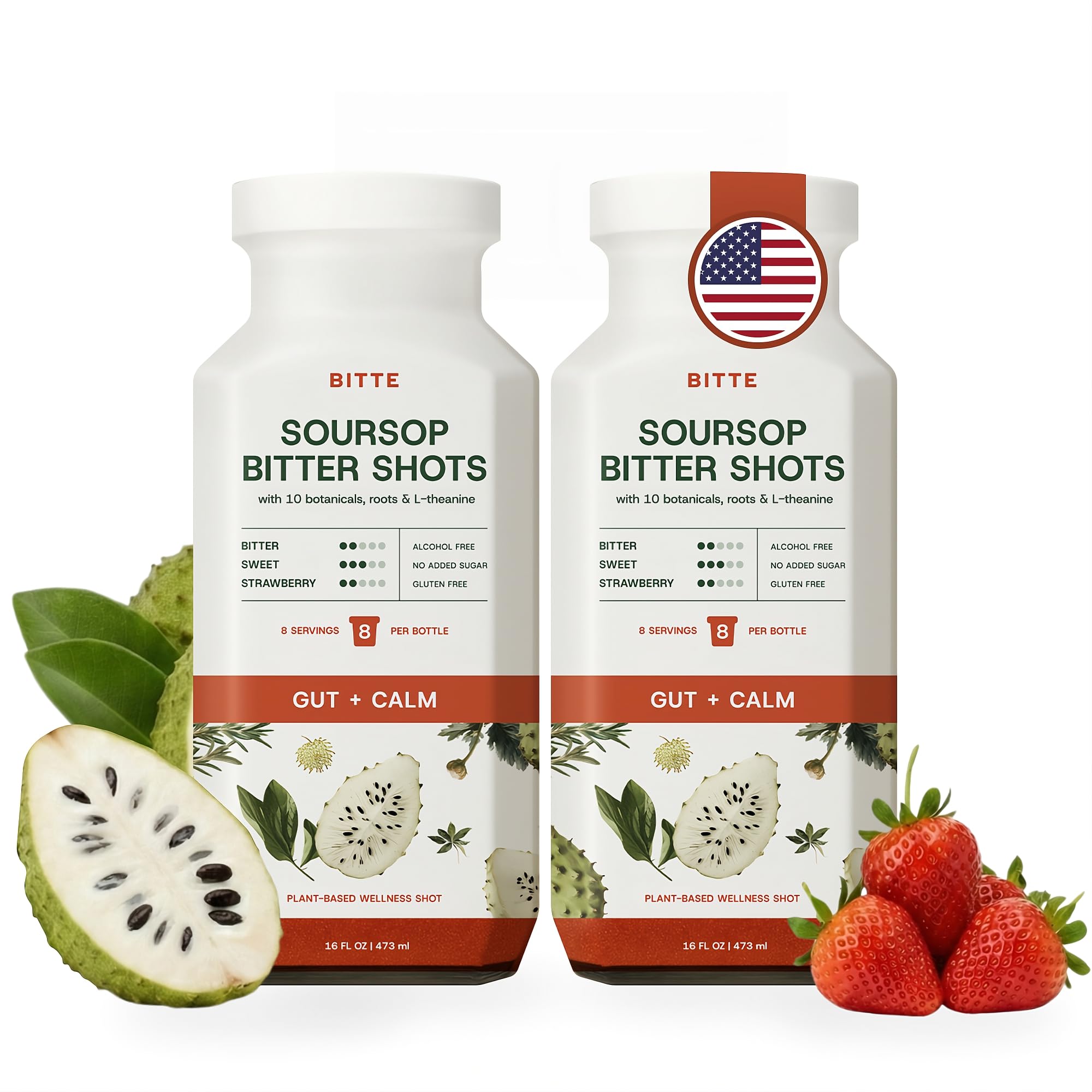bitte Gut + Calm Soursop Shots 2 Pack Ready to Drink Strawberry Soursop Unique Duo: Whole Super Fruit + Herbal Bitters Eco-Friendly Glass Bottle Clean Formula 32 fl oz Total (16 Servings) 16 Fl Oz (Pack of 2)