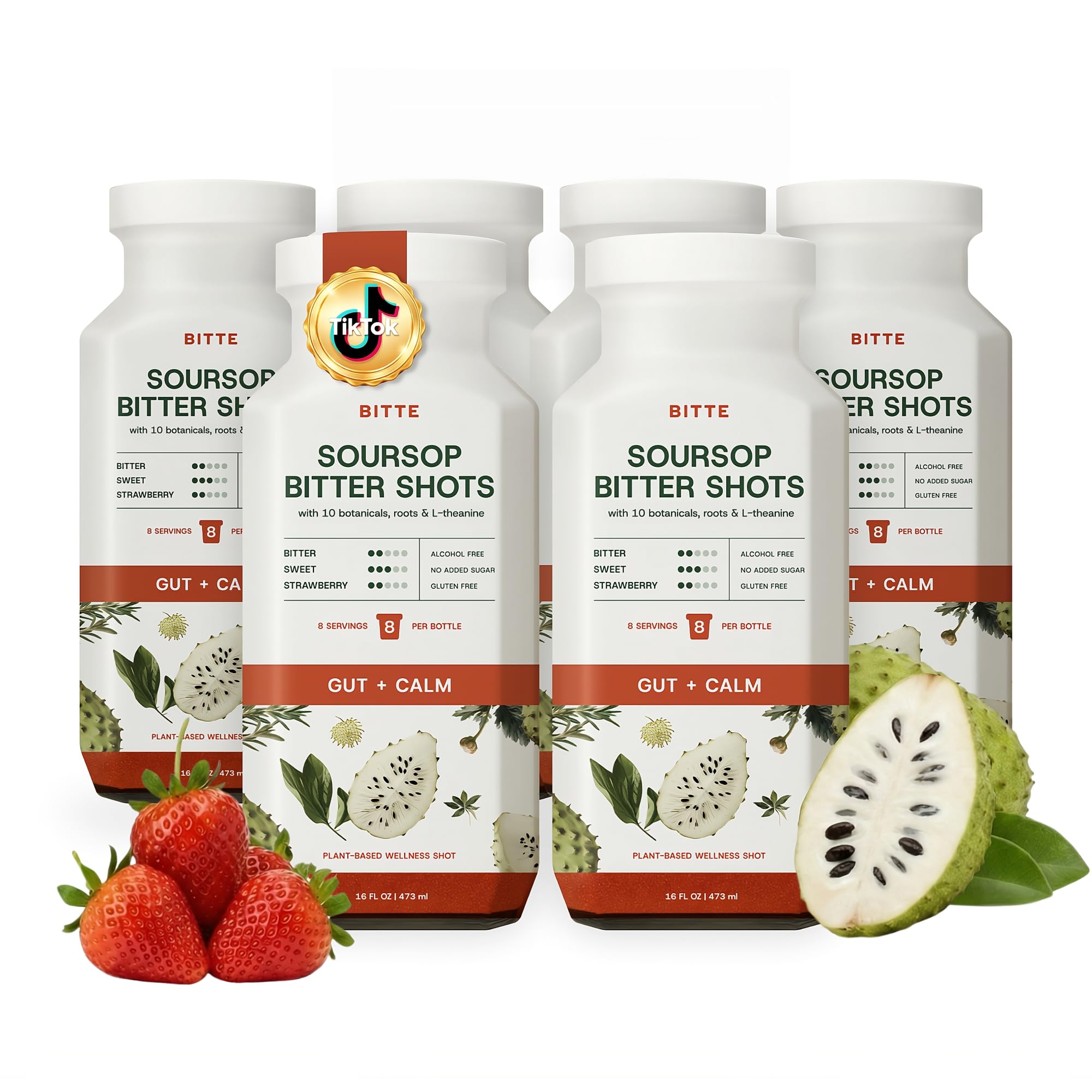 bitte Gut + Calm Soursop Shots 6 Pack Ready to Drink Strawberry Soursop Whole Super Fruit + Herbal Bitters 24-Hour Support Ritual Eco-Friendly Glass Bottle 96 fl oz Total (48 Servings) 2.67 Fl Oz (Pack of 6)
