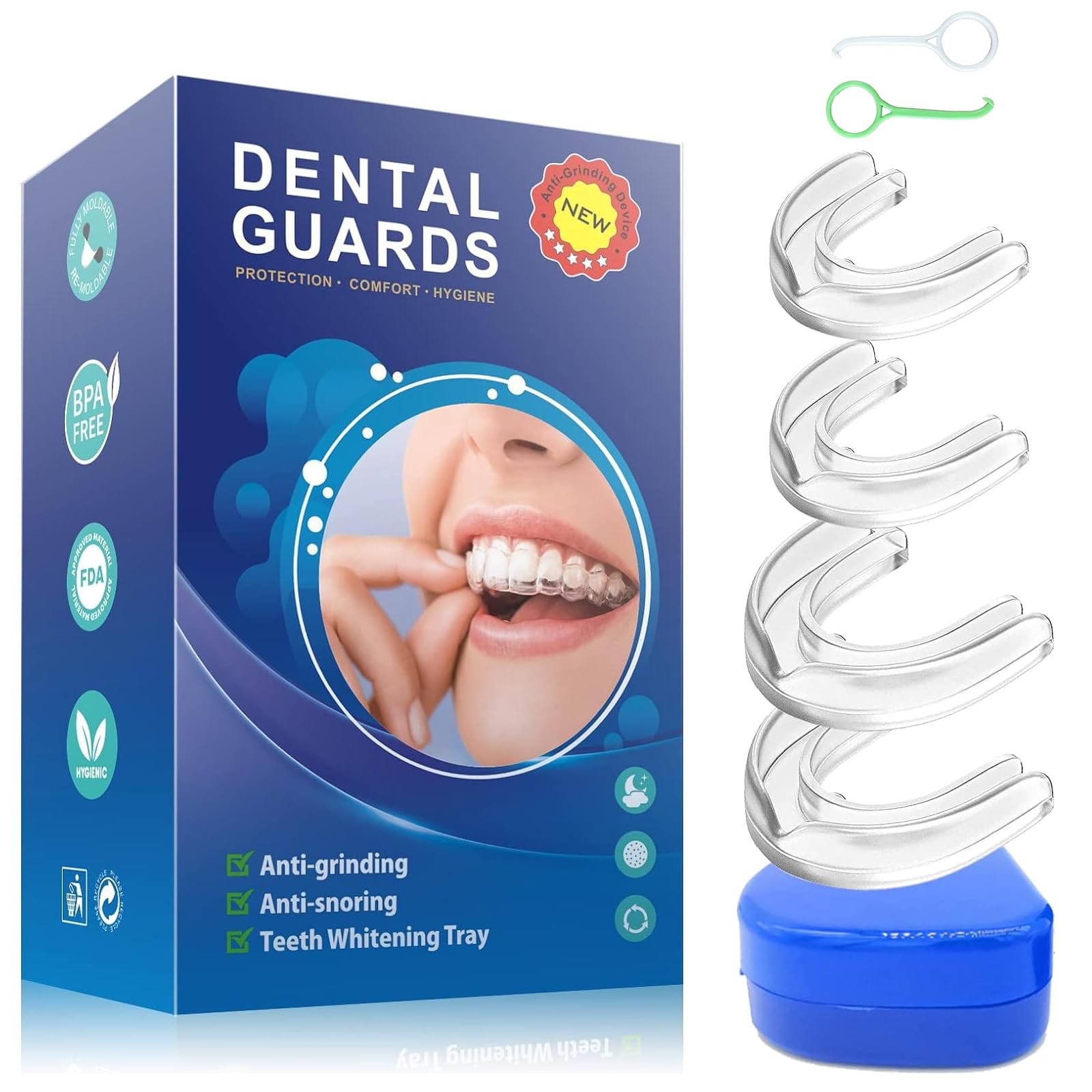 ✓?Gift?: If you or your family and friends suffer from teeth grinding or snoring at night, this product would be a good gift for yourself and your family and friends. ✓?4 Pcack & 2 Sizes?Our night mouth guard set has a total of 4 mouthguards, 2 sizes, 2 large mouthguards, 2 small mouthguards, when you are not using the mouth guard for sleeping, you can store it in the tooth box for easy storage and safekeeping. ✓?Safe and Durable? Made from high-quality materials, our reusable mouth guard is soft, flexible, and easy to clean, ensuring long-lasting use. ✓?Custom Moldable Design? Easily mold the dental guard to fit your mouth perfectly for maximum comfort and support, providing full protection throughout the night. ✓?Experience a Restful Night’s Sleep? Our premium grade mouth guard prevents teeth grinding, reducing damage and annoying grinding noise associated with bruxism.