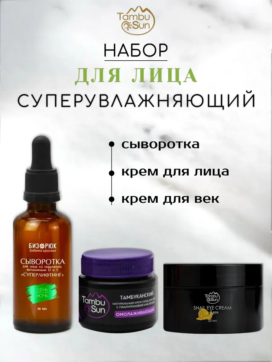 Набор: сыворотка гиалуроновая, крем для лица омолаживающий и крем для век бережный уход.