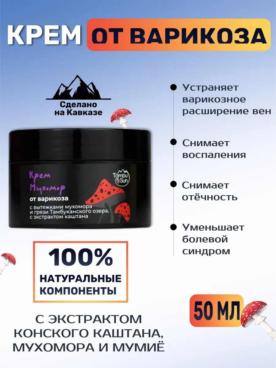в области икроножных мышц. MYX0M0Р в сочетании с вытяжкой целебной тамбуканской грязи ценится за свои способности улучшать микроциркуляцию крови, а такое вещество, как лентинан в составе гриба эффективно предотвращает процесс преждевременного разрушения кожных кровеносных микрокапилляров, благодаря чему крем незаменим в устранении варикозного расширения вен.