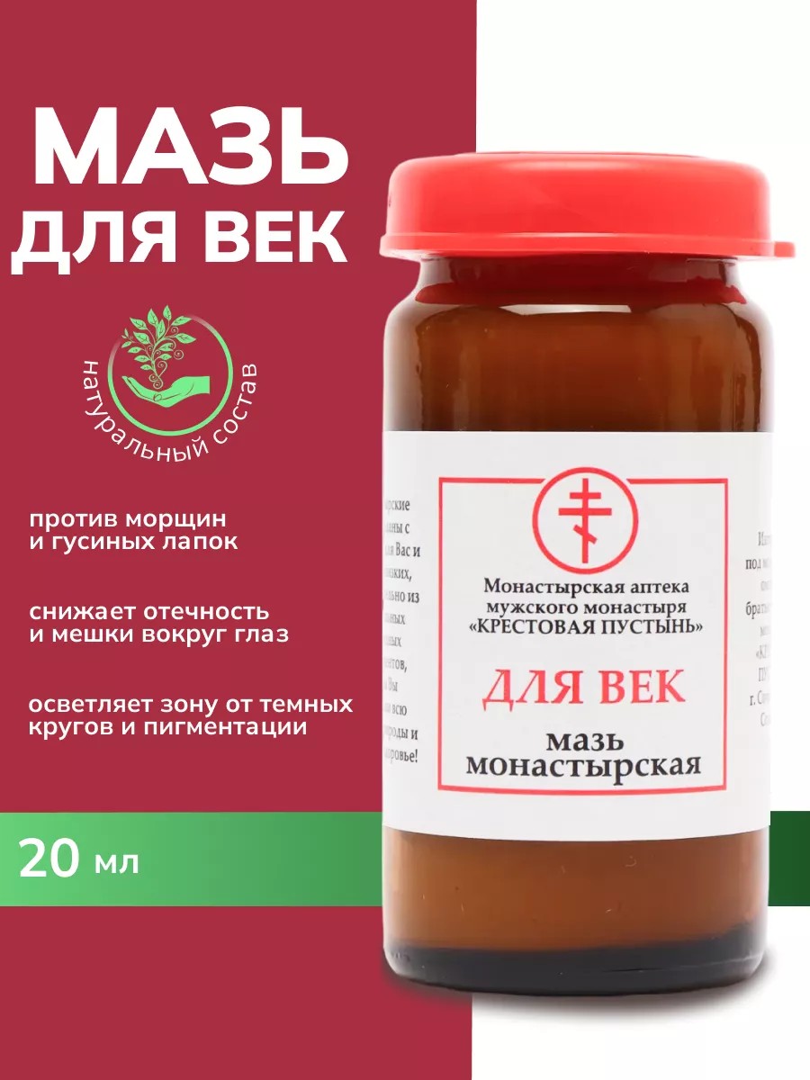 Антивозрастной Крем для век против морщин и темных кругов вокруг глаз, от отеков 20 мл. Природные компоненты, входящие в состав монастырской мази для век, издавна применялись при мешках и воспалении, аллергии и глазных болезнях. Так же можно использовать от отечности при ПМС и заложенности носа, темных кругах и пигментации. Она хорошо поможет при расширении сосудов и усталости, обезвоженности кожи и выраженной мимике, ослабленном и провисающем нижнем веке, мелких морщинках чувствительной зоны. Омолаживающий продукт без парабенов не вызывает аллергии, в составе только натуральные природные компоненты. Способ применения: наносить нежными и похлопывающими движениями в области кончиками безымянных пальцев. Не втирать, не массировать