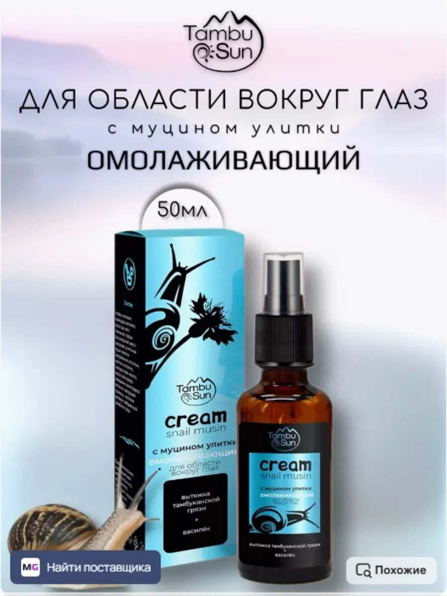 От тёмных кругов, отёков, морщин.Омолаживающий крем «TambuSun» – это эффективное средство для ухода за чувствительной и нежной кожей век. Уникальный по составу улиточный муцин обладает омолаживающим и лифтинг свойствами, может глубоко проникать в дерму, разглаживать и сокращать морщины, предупреждать появление гусиных лапок в уголках глаз, питать и увлажнять эпидермис. А вытяжка тамбуканской грязи способна защищать от обезвоживания, появления тёмных кругов и мешков под глазами, насыщая клетки минеральным комплексом, поддерживающим состояние увлажнённости.
