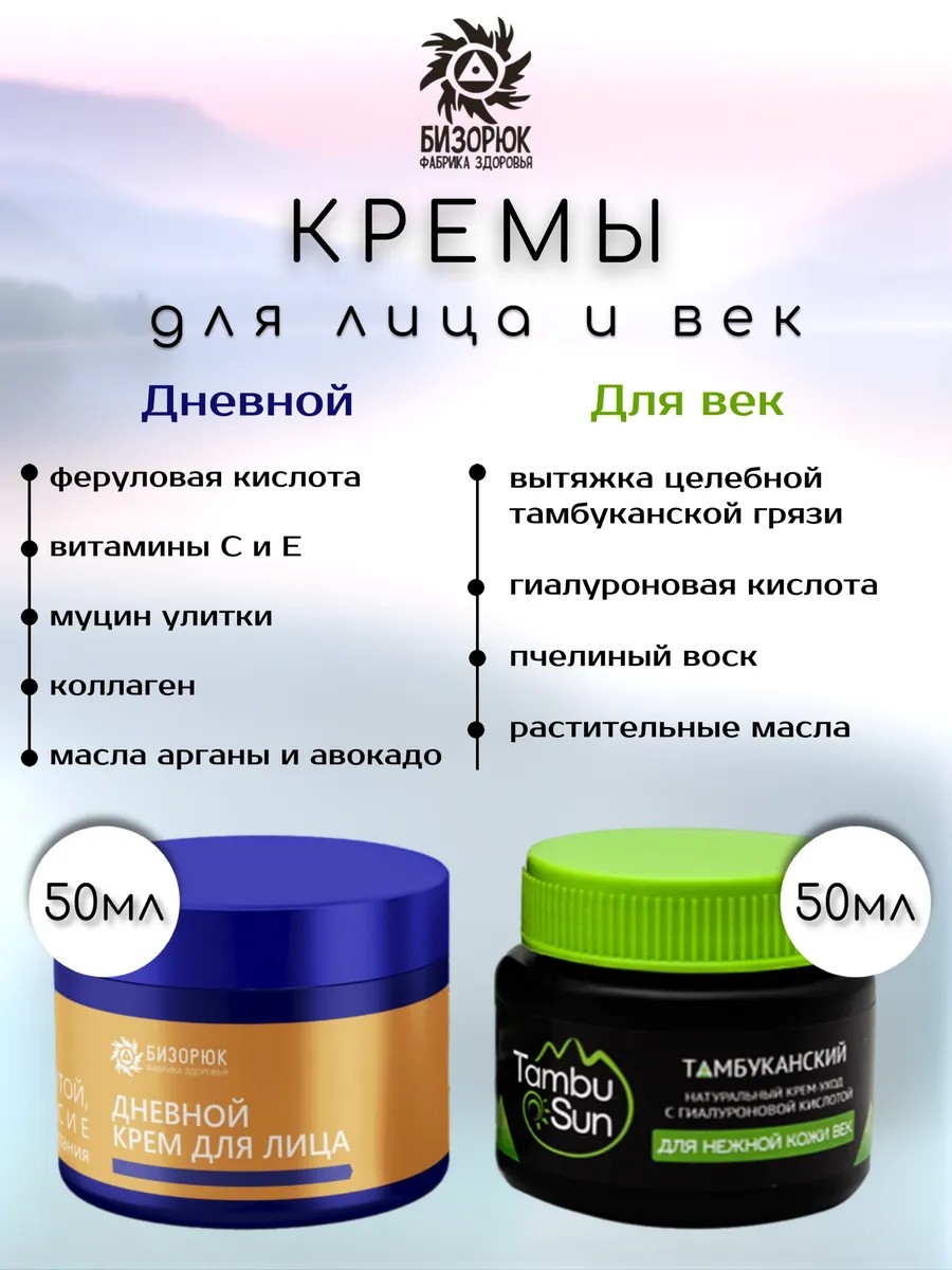 Cream Set: Day cream with ferulic acid provides a comprehensive treatment for facial skin, reducing the appearance of age and expression wrinkles, inflammation, and breakouts. Ferulic acid is valued for its ability to stimulate collagen and elastin production and has an SPF factor, protecting the epidermis from the harmful effects of UVA/UVB rays. A combination of vitamins C and E has moisturizing and anti-inflammatory properties, allowing the cream to gently smooth scar tissue and reduce acne and post-acne marks. A gentle eye cream with healing Tambukan mud extract, hyaluronic acid, and Caucasian herbal and plant extracts is a gentle treatment for the skin around the eyes. The cream's rich, nutrient-rich ingredients deeply nourish and replenish delicate skin, improve its health and regeneration, eliminate fine lines, tighten and smooth the skin, and prevent premature aging. The cream will help eliminate age spots, dark circles and bags, puffiness, and inflammation. Hyaluronic acid enhances the effectiveness of the cream's ingredients, normalizes moisture balance in skin cells, prevents moisture loss, eliminates dryness, rejuvenates, and protects the skin from external factors.