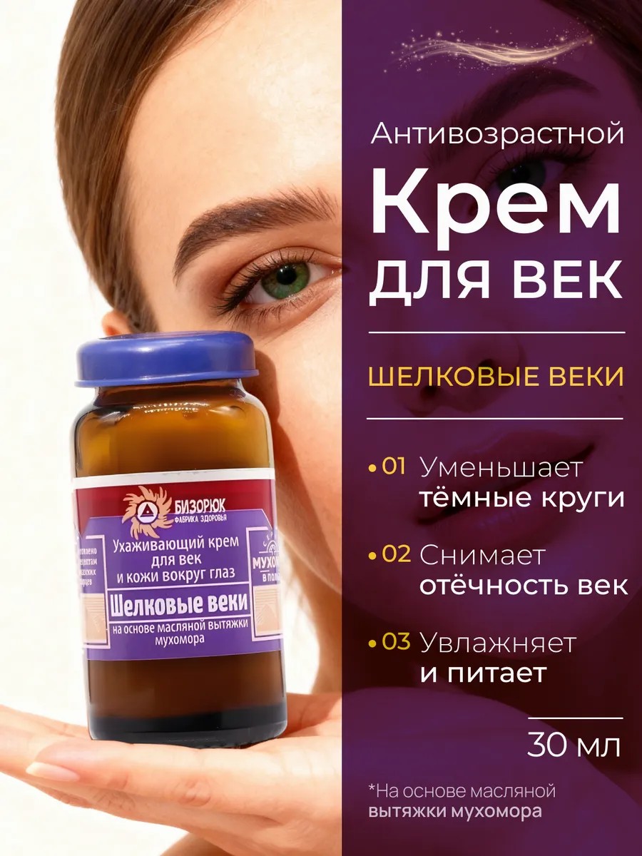 Натуральный Крем для век антивозрастной от ранних морщин и темных кругов вокруг глаз 30 мл. Создан на основе масляной вытяжки гриба муx-ра и экстрактов лекарственных растений. Ценится за способность оказывать воздействие против отеков и мешков под глазами. Полезные масла в составе могут интенсивно питать и увлажнять эпидермис, стимулировать клеточное обновление и восстановление, уменьшать круги. Подходит для самой нежной, сухой, зрелой чувствительной кожи. Омолаживающий крем имеет супер легкую текстуру, быстро впитывается, поэтому может использоваться как дневной и ночной уход, так и база под макияж. Небольшое количество нанести на чистую кожу вокруг глаз нежными похлопывающими движениями пальцев. Не втирать и не массировать. Избегать попадания в глаза.