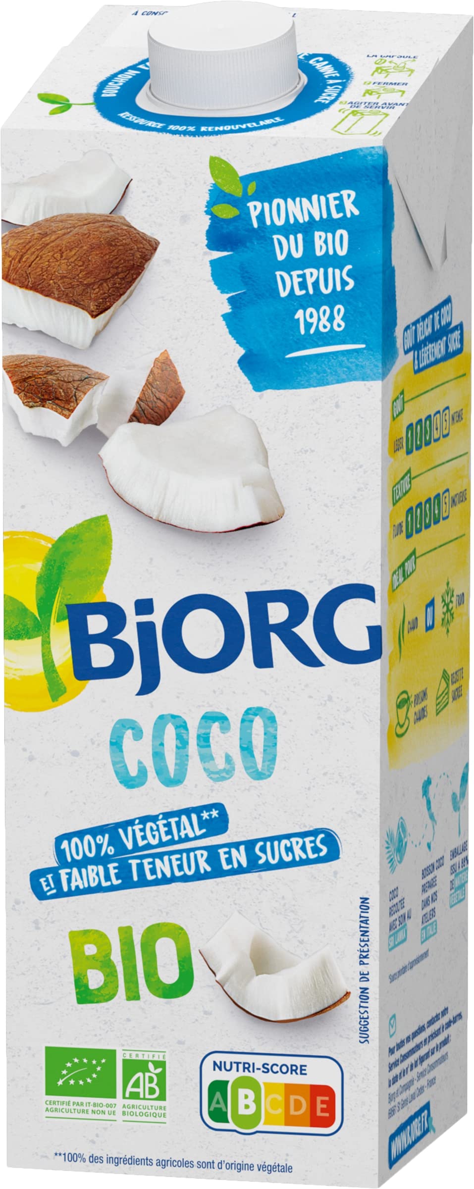 Treat yourself to this refreshing drink. It will surprise you with its natural and light coconut taste. Ideal for a gourmet refreshing break, this drink is drunk very cold but can also give a subtle coconut note to your tea, your coffee or your recipes. Quantity: 1l. BRAND STORY BJORG, AN ORGANIC PIONEER BJORG HAS FIGHTED SINCE THE 1980S TO OFFER AS MANY PEOPLE ANOTHER ORGANIC FOOD, FRIENDLY FOR THE ENVIRONMENT AND THE WELL-BEING OF ALL. At the origin of the project, an awareness of the growing dangers linked to polluting productivity agriculture and food processes which distort the products. The brand then offered an alternative to the food standards of the time by offering organic products for the first time in France in large and medium-sized supermarkets. WITH BJORG, ANOTHER FOOD IS POSSIBLE! From its origins, the brand has designed organic products respecting natural tastes and balance. She selects ingredients naturally rich in nutrients, and combines them because of their complementarity to obtain an interesting nutritional balance. Bjorg is the first brand to introduce the French to the benefits of rice cakes, almond drinks, organic soy, fair trade green tea. Today, Bjorg is the leading French brand of organic food products. With nearly 180 organic products, Bjorg allows you to create organic menus every day, according to your desires and needs. Convinced that what we eat every day contributes to our health tomorrow, Bjorg founded the concept of Bio-Nutrition, which is based on the rigorous selection of ingredients, the nutritional benefits of its products and the preservation of taste. 100 of the range complies with the requirements of European regulations on products from organic farming. Exception: Mackerel: wild fish cannot be organic.100 of the ingredients are of agricultural origin and were obtained according to organic production rules. Water, coconut milk (11 ), cane sugar (3 ), unrefined sea salt. With 32kcal per 100ml, this drink is particularly low in calories. Faites vous plaisir avec cette boisson rafraîchissante. Elle vous surprendra par son goût naturel et léger de coco. Idéale pour une pause fraîcheur gourmande, cette boisson se boit très fraîche mais peut également donner une note subtile de coco à votre thé, votre café ou vos recettes. Quantité : 1l. BRAND STORY BJORG, UN PIONNIER DU BIO BJORG SE BAT DEPUIS LES ANNÉES 1980 POUR OFFRIR AU PLUS GRAND NOMBRE UNE AUTRE ALIMENTATION BIOLOGIQUE , RESPECTUEUSE DE L'ENVIRONNEMENT ET DU BIEN-ÊTRE DE TOUS. A l'origine du projet, une prise de conscience des dangers croissants liés à une agriculture productiviste polluante et à des process alimentaires dénaturant les produits. La marque propose alors une alternative aux standards alimentaires de l'époque en offrant pour la première fois en France des produits biologiques dans les grandes et moyennes surfaces. AVEC BJORG, UNE AUTRE ALIMENTATION EST POSSIBLE ! Dès son origine, la marque conçoit des produits biologiques respectant les goûts et l'équilibre naturels. Elle sélectionne des ingrédients naturellement riches en nutriments, et les associe en raison de leur complémentarité pour obtenir un équilibre nutritionnel intéressant. Bjorg est la première marque à faire découvrir aux Français les bienfaits des galettes de riz, de la boisson aux amandes, du soja biologique, du thé vert équitable. Aujourd'hui, Bjorg est la première marque française de produits alimentaires biologiques. Avec près de 180 produits bio, Bjorg vous permet de composer au quotidien des menus biologiques, selon vos envies et vos besoins. Convaincue que ce que nous mangeons chaque jour contribue à notre santé de demain, Bjorg a fondé le concept de Bio-Nutrition, qui repose sur la sélection rigoureuse des ingrédients, les bénéfices nutritionnels de ses produits et la préservation du goût. 100 de la gamme respecte les exigences de la réglementation européenne sur les produits issus de l'agriculture biologique. Exception : Maquereaux : les poissons sauvages ne peuvent pas être bio.100 des ingrédients d'origine agricole ont été obtenus selon les règles de la production biologique. Eau, lait de coco (11 ), sucre de canne (3 ), sel marin non raffiné. Avec 32kcal pour 100ml, cette boisson est particulièrement peu calorique.