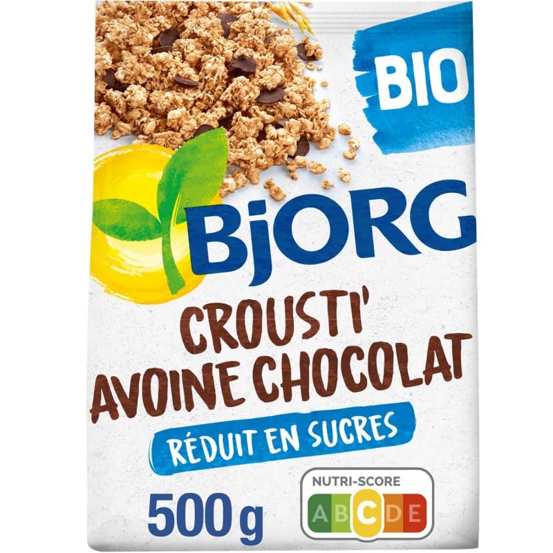 : Bjorg Chocolate Oat Crunch is a delicious blend of oats, oat bran, and dark chocolate chips. This cereal contains oat bran and is guaranteed palm oil-free. It will give you energy for the morning! Ingredients: Wholegrain OAT flakes 52 , unrefined cane sugar , dark chocolate 10 (cocoa mass , cane sugar , cocoa butter ), puffed rice , OAT flour 7 , OAT bran 5 , sunflower oil (high oleic sunflower oil , antioxidant: tocopherol-rich extract), stabilizer: acacia gum coconut flakes , sea salt. Organic ingredients. Caution: A food supplement is not a substitute for a balanced and varied diet and a healthy lifestyle. Do not exceed the recommended daily intake.Chocolate Oat Crunch 500g. BJORG. Organic. Dietary and Nutritional. Savory Grocery.Description du produit Le Crousti'Avoine chocolat Bjorg est un savoureux mélange d'avoine, de son d'avoine et de pépites de chocolat noir. Ces céréales contiennent du son d'avoine, et sont garantis sans huile de palme. Ils vous apporteront de l'énergie pour la matinée !. Ingrédients Flocons d'AVOINE complète 52 , sucre de canne non raffiné, chocolat noir 10 (pâte de cacao , sucre de canne , beurre de cacao ), riz soufflé, farine d'AVOINE 7 , son d'AVOINE 5 , huile de tournesol (huile de tournesol oléique, antioxydant: extrait riche en tocophérols), stabilisant: gomme d'acacia flocons de NOIX de coco , sel marin. Ingrédients biologiques. Attention : un complément alimentaire ne se substitue pas à un régime alimentaire équilibré, varié et à un mode de vie sain . Ne pas dépasser la quantité récommandée.Crousti Avoine Chocolat 500G. BJORG. Biologique. Diététique Et Nutrition. Epicerie Salée.BJORG - Crousti Avoine Chocolat 500G - Lot De 3
