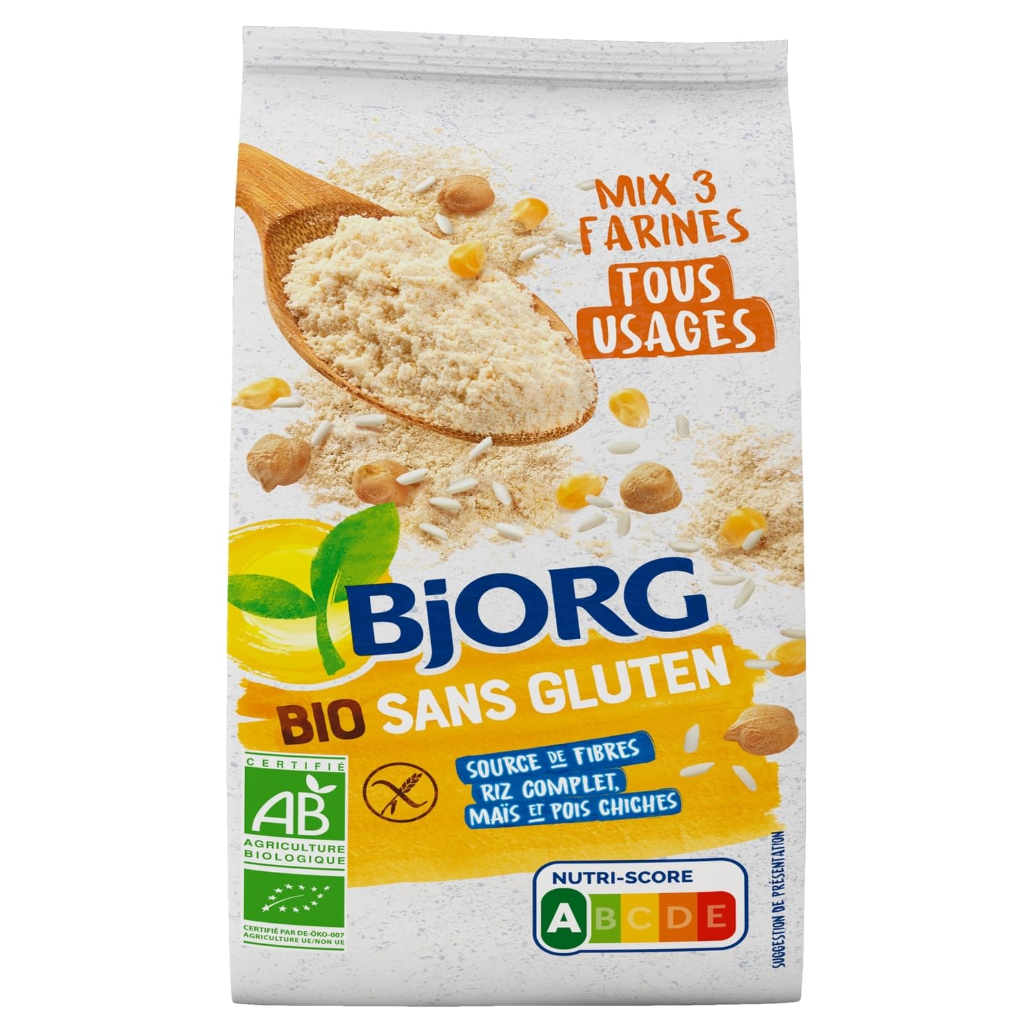 The 3 Flour Mix is a subtle blend of rice, chickpea and corn flours. Thanks to this blend, there is no need to accumulate flours in your cupboards. You now have a mix at hand to make your savory and sweet recipes. Ingredients: Whole rice flour 60 , corn flour 15 , corn starch 15 , chickpea flour 10 Storage: Store away from light and humidity INGREDIENTS Whole rice flour 60 , corn flour 15 , corn starch 15 , chickpea flour 10ORGANIC AND PLANT-BASED SINCE ALWAYS: A pioneer in organic products for the general public since 1988, Bjorg offers plant-based and gourmet alternatives to traditional foods, to delight you while increg the proportion of plants in your meals. HOW TO USE THE 3 FLOUR MIX?: This flour mix can be used like wheat flour to thicken a sauce, prepare a pancake or cake batter, or to make shortcrust, puff or shortbread pastry. REPLACES CONVENTIONAL FLOUR: Ideal for meeting the needs of people intolerant to gluten or those who prefer to avoid this protein, this organic flour is a perfect substitute for traditional wholemeal flour. THE ADVANTAGES OF THIS ORGANIC FLOUR: A source of dietary fiber (4.9 g 100 g), this flour made from unprocessed legumes and cereals is made from 100 ingredients from organic farming. BJORG GLUTEN-FREE FLOUR: The 3-flour mix is a blend of organic chickpea flour, corn flour, and rice flour, all three gluten-free, for making all your savory or sweet recipes. Le Mix 3 Farines est un subtil mélange de farines de riz, de pois chiche et de maïs. Grâce à ce mélange, inutile d'accumuler les farines dans vos placards. Vous avez ainsi à portée de main, un mix pour réaliser vos recettes salées et sucrées. Ingrédients : Farine de riz complet 60 , farine de maïs 15 , amidon de maïs 15 , farine de pois chiches 10 Conservation : À conserver à l'abri de la lumière et de l'humidité INGRÉDIENTS Farine de riz complet 60 , farine de maïs 15 , amidon de maïs 15 , farine de pois chiches 10BIO ET VÉGÉTALE DEPUIS TOUJOURS : Pionnière du bio grand public depuis 1988, Bjorg propose des alternatives végétales et gourmandes aux aliments traditionnels, pour vous régaler tout en augmentant la part de végétal dans vos repas. COMMENT UTILISER LE MIX 3 FARINES ? : Ce mélange de farines peut être utilisé comme la farine de blé pour épaissir une sauce, préparer une pâte à crêpes ou un gâteau, ou pour confectionner des pâtes brisées, feuilletées ou sablées. REMPLACE LA FARINE CLASSIQUE : Idéale pour répondre aux besoins des personnes intolérantes au gluten ou à celles qui préfèrent éviter cette protéine, cette farine bio se substitue parfaitement à la farine complète traditionnelle. LES ATOUTS DE CETTE FARINE BIO : Source de fibres alimentaires (4,9 g 100 g), cette farine à base de légumineuses et céréales non transformées est conçue à partir de 100 d'ingrédients issus de l'agriculture biologique. FARINE SANS GLUTEN BJORG : Le mix 3 farines est un mélange de farine de pois chiche, farine de maïs et farine de riz bio, toutes trois sans gluten, pour réaliser toutes vos recettes salées ou sucrées.