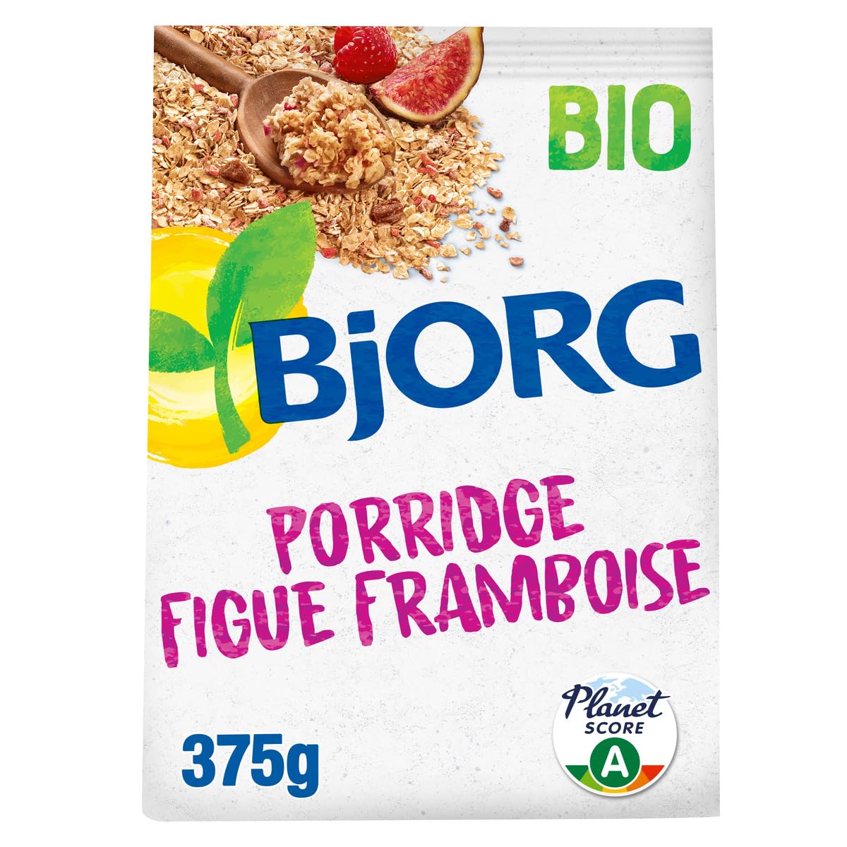 : The first brand to offer organic products sold in supermarkets, Bjorg was founded in France in 1988 with a simple ambition: to make organic, healthy, and balanced food accessible to everyone, combining taste, quality, and deliciousness. Created by a nutritionist, Bjorg is a French brand that, in addition to being a pioneer in mainstream organic products, constantly strives to improve by expanding its range of plant-based drinks, organic cereals, energy bars, organic biscuits, vegan desserts, and other products that have made it famous for over 30 years. 100 organic and ethical, the entire Bjorg range is guaranteed palm oil-free. Certified as a B Corp in 2017, the brand also created the Bjorg, Bonneterre Citizens Foundation, promoting a healthy, sustainable, and more nature-connected food model. At Bjorg, each ingredient is carefully chosen for its nutritional qualities, with a focus on fiber, whole-grain flours, and natural sugars, while minimizing the use of white flour, refined sugars, and salt. Thanks to its meticulously crafted recipes, Bjorg also reduces the saturated fat content of its products, helping you consume less of it daily. 70 of Bjorg products have a Nutri-Score of A or B, and all are suitable for vegetarians. Perfect for a boost of energy, Bjorg cereals satisfy all your cravings. Made with whole grains, they help increase your fiber and mineral intake in a simple and delicious way. A typical Nordic breakfast, porridge is a delicious way to enjoy a balanced breakfast, rich in fiber and protein. Bjorg Fig Raspberry Porridge can be enjoyed on its own or with other fruits to start your day off right. Ingredients: Oat flakes 91 , Dried fig 4 (figs , rice flour ), Raisins 3 (raisins , sunflower oil ), Freeze-dried raspberry 2 . May contain traces of milk, nuts, sesame seeds, and soy. Organic ingredients.