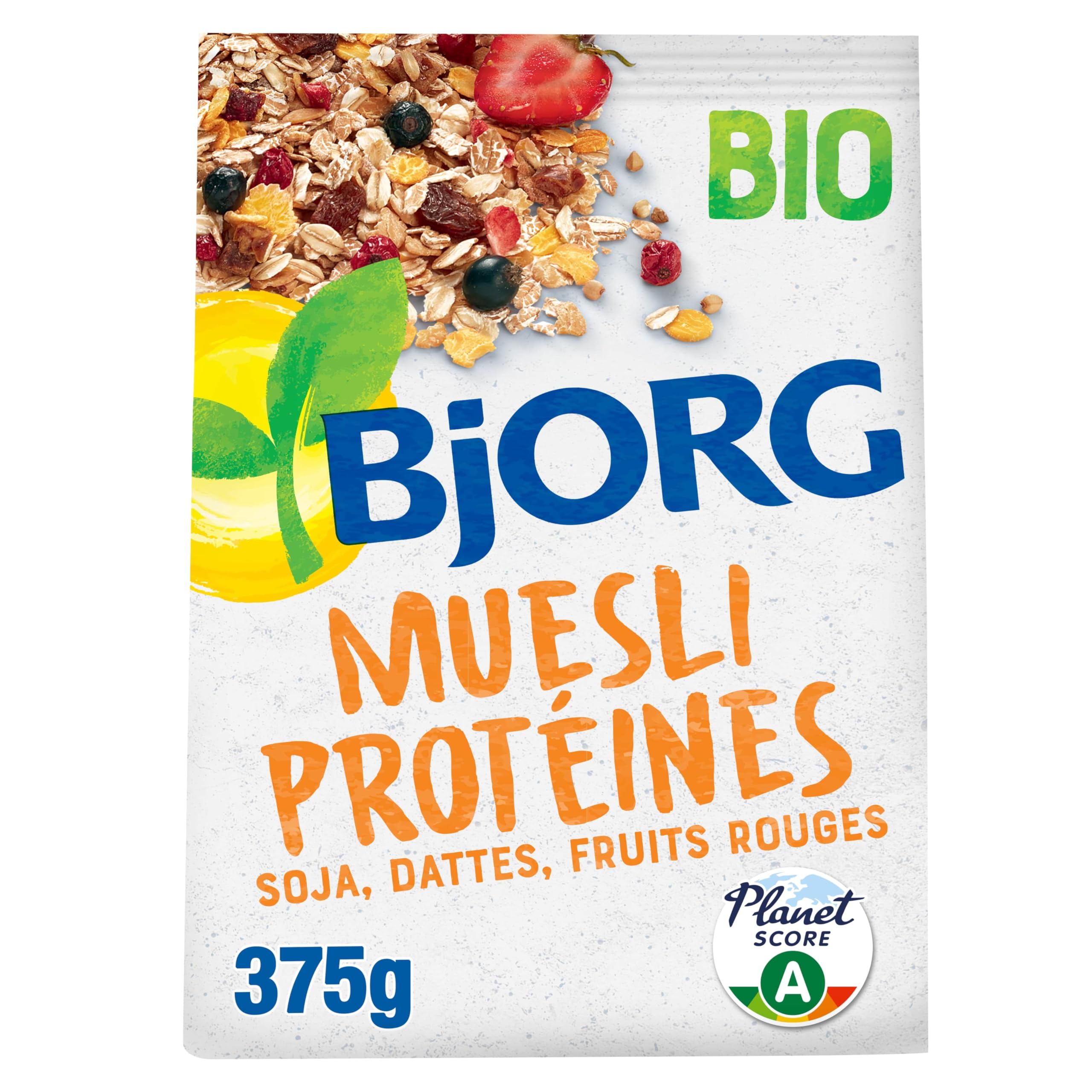 The first brand to offer organic products sold in supermarkets, Bjorg was born in France in 1988 with a simple ambition: to provide everyone with access to organic, healthy and balanced food that combines taste, quality and deliciousness. Created by a nutritionist, Bjorg is a French brand which, in addition to being a pioneer of organic products for the general public, is constantly seeking to improve by expanding its range of plant-based drinks, organic cereals, energy bars, organic biscuits, vegan desserts and other references that have made it famous for over 30 years. 100 organic, but also ethical, the entire Bjorg range is guaranteed without palm oil. Certified B-Corp in 2017, the brand also created the Bjorg, Bonneterre and Citoyens foundation encouraging a healthy, sustainable eating model that is better connected to nature. At Bjorg, each ingredient is carefully chosen for its nutritional qualities, giving pride of place to fiber, wholemeal flour and natural sugars and limiting the use of white flour, refined sugars and salt as much as possible. Thanks to its carefully thought-out recipes, Bjorg also reduces the saturated fatty acid content of its products, to help you consume less on a daily basis. 70 of Bjorg references display a Nutri-Score of A or B, almost all of them are suitable for vegetarians. Perfect for stocking up on energy, Bjorg cereals accompany all your gourmet desires. Made from whole grains, they help increase your fiber and mineral intake in a simple and tasty way. Protein Muesli contains soy, dates and red fruits as well as wheat and oats. Rich in protein, it is ideal for starting the day well and goes wonderfully in all vegetarian recipes! INGREDIENTS SOY flakes 33 , OAT flakes , WHEAT flakes , raisins 8 (grapes , sunflower oil ), dates 5 (dates , rice flour ), freeze-dried red fruits 1.4 (currants , blackcurrants , strawberries ), buckwheat seeds . Organic ingredients DIRECTIONS FOR USE To preserve the crispness of this muesli, we advise you to store it away from humidity. DISCLAIMER Non-contractual photography. The above indications are given for information purposes. They are not necessarily exhaustive and cannot replace the information appearing on the product packaging which alone is authentic, and to which you are invited to refer, particularly in the event of food intolerance. ORGANIC AND PLANT-BASED SINCE ALWAYS: A pioneer in organic products for the general public since 1988, Bjorg offers plant-based and gourmet alternatives to traditional foods, to delight you while increg the proportion of plants in your meals. HOW TO ENJOY THIS MUESLI?: This muesli can be enjoyed by mixing it with a plant-based drink, with or without other fresh or dried fruits. It can also be incorporated into a verrine, dessert or smoothie recipe. ECO-RESPONSIBLE PACKAGING: Made in Germany, the packaging of this muesli is made from 50 sugar cane, a renewable material, and is small in size to limit its impact on the environment. THE ADVANTAGES OF THIS MUESLI: 100 organic, this protein-rich muesli is made from a recipe based on whole grains (oats, wheat), with no added sugars other than those naturally present in its ingredients. SOY, DATES AND RED FRUIT MUESLI: Ideal for starting your day off right, Bjorg Protein Muesli combines soy flakes, dates, red fruits and raisins for a delicious and original breakfast. Première marque à proposer des produits bio vendus en grande surface, Bjorg est née en France, en 1988, avec une ambition simple : permettre à tous d'accéder à une alimentation biologique, saine et équilibrée qui allie goût, qualité et gourmandise. Créée par une nutritionniste, Bjorg est une marque française qui, en plus d'être une pionnière du bio grand public, cherche sans cesse à s'améliorer en élargissant sa gamme de boissons végétales, céréales bio, barres énergétiques, biscuits bio, desserts vegan et autres références qui font sa célébrité depuis plus de 30 ans. 100 biologique, mais aussi éthique, toute la gamme Bjorg est garantie sans huile de palme. Certifiée B-Corp en 2017, la marque a également créé la fondation Bjorg, Bonneterre et Citoyens encourageant un modèle d'alimentation sain, durable et mieux connecté à la nature. Chez Bjorg, chaque ingrédient est choisi avec soin pour ses qualités nutritionnelles en faisant la part belle aux fibres, farines complètes et sucres naturels et en limitant au maximum l'utilisation de farine blanche, de sucres raffinés et de sel. Grâce à ses recettes minutieusement pensées, Bjorg réduit aussi la teneur en acides gras saturés de ses produits, pour vous aider à en consommer moins au quotidien. 70 des références Bjorg affichent un Nutri-Score de A ou B, quasiment toutes conviennent aux végétariens. Parfaites pour faire le plein d'énergie, les céréales Bjorg accompagnent toutes vos envies gourmandes. À base de céréales complètes, elles aident à augmenter votre consommation de fibres et de minéraux de façon simple et savoureuse. Le Muesli Protéines contient du soja, des dattes et des fruits rouges ainsi que du blé et de l'avoine. Riche en protéines, il est idéal pour bien commencer la journée et s'intègre à merveille dans toutes les recettes végétariennes ! INGRÉDIENTS Flocons de SOJA 33 , flocons d'AVOINE , flocons de BLÉ , raisins secs 8 (raisins , huile de tournesol ), dattes 5 (dattes , farine de riz ), fruits rouges lyophilisés 1,4 (groseilles , cassis , fraises ), graines de sarr . Ingrédients biologiques MODE D'EMPLOI Pour préserver la croustillance de ce muesli, nous vous conseillons de le conserver à l'abri de l'humidité. CLAUSE DE NON-GARANTIE Photographie non contractuelle. Les indications ci-dessus sont données à titre d'information. Elles ne sont pas forcément exhaustives et ne sauraient se substituer aux informations figurant sur l'emballage du produit qui font seules foi, et auxquelles vous êtes invités a vous reporter,notamment en cas d'