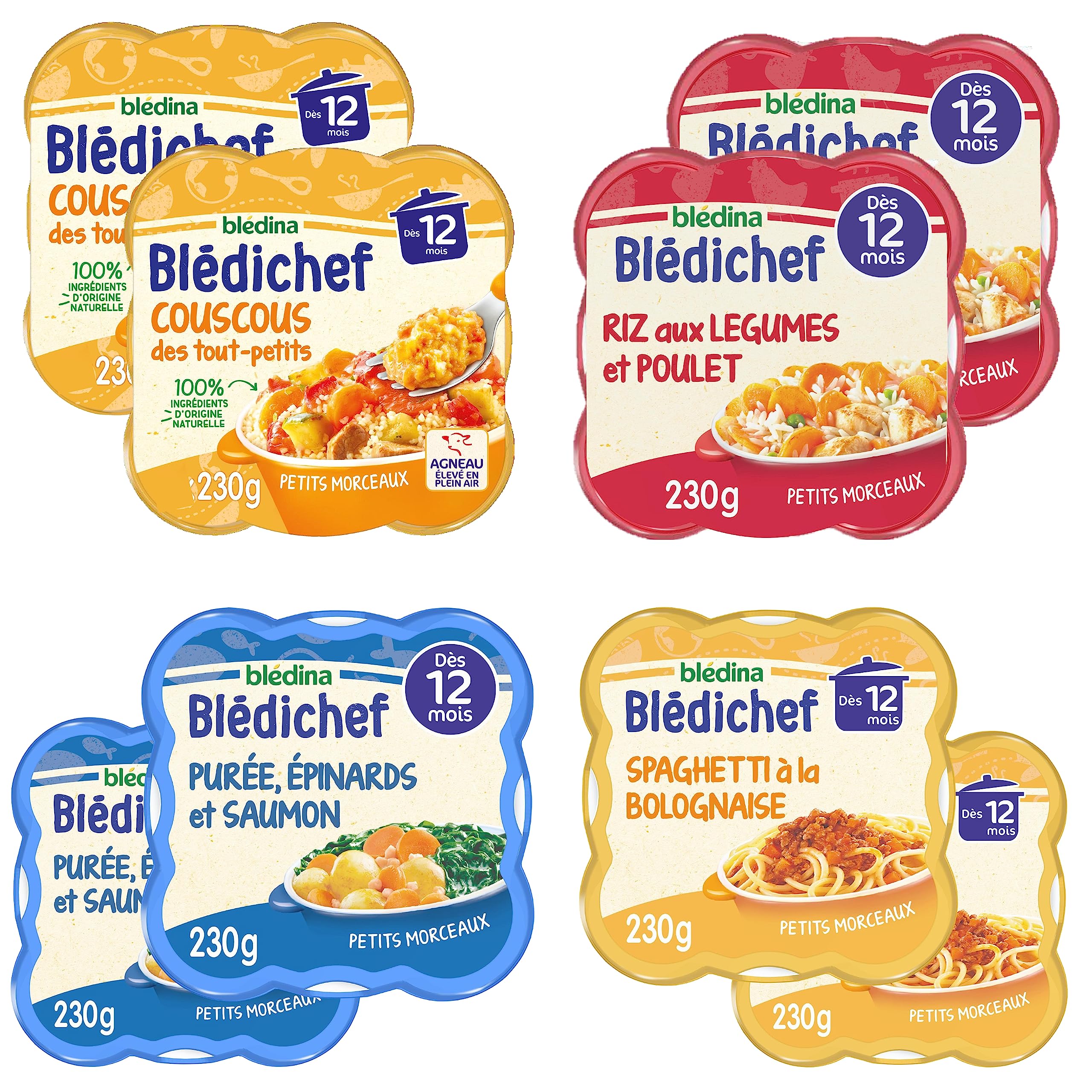 BLÉDINA: For over 110 years, Blédina has been committed to providing health through nutrition during the first 1000 days of a baby's life. With the desire to pass on good eating habits to all babies. Blédina is a certified B-Corp company and is committed to meeting social and environmental criteria. DIRECTIONS FOR USE Before opening, store at room temperature in a clean, dry place. SAFETY WARNING Not Applicable A PRACTICAL PLATE: The shape of the Blédichef plate is designed to help baby learn to eat alone! Easy to prepare and resealable, it can be taken everywhere with you. QUALITY PRODUCTS: Small dishes cooked in France with rigorously selected ingredients, without flavorings or preservatives , to satisfy the demanding palates of babies. ( In accordance with infant feeding regulations.). DISHES ADAPTED FOR BABY: Adult dishes adapted by our chef for toddlers, with small pieces, all in an easy-to-carry plate. Our dishes are cooked by our chef in our factory in Brive-La-Gaillarde (Corrèze). 4 RECIPES: Spinach and Pacific Salmon Purée Vegetable and Chicken Rice Little Spaghetti Bolognese Toddler Couscous. BABY PLATE: Discover our Blédichef lunch and dinner pack from 12 months, in a new format of 8 plates which consists of Blédichef seafood recipes, Blédichef Inspired by our regions as well as Blédichef Inspired by the World. BLÉDINA : Depuis plus de 110ans, Blédina s'engage à apporter la santé par l'alimentation pendant les 1000 premiers jours de vie de bébé. Avec l'envie de transmettre les bonnes habitudes alimentaires à tous les bébés. Blédina est une entreprise certifiée B-Corp est s'engage à répondre aux critères sociaux et environnementaux. MODE D'EMPLOI Avant ouverture, conserver à température ambiante dans un endroit propre et sec. AVERTISSEMENT DE SÛRETÉ Non Applicable UNE ASSIETTE PRATIQUE : La forme de l'assiette Blédichef est conçue pour aider bébé à apprendre à manger seul ! Facile à préparer et refermable, elle peut être emportée partout avec vous. PRODUITS DE QUALITE : Des petits plats cuisinés en France avec des ingrédients rigoureusement sélectionnés, sans arômes, ni conservateurs , pour satisfaire les palais exigeants des bébés. ( Conformément à la réglementation d'alimentation infantile.). DES PLATS ADAPTES POUR BEBE : Des plats de grands adaptés par notre chef pour les tout-petits, avec des petits morceaux, le tout dans une assiette facile à transporter. Nos plats sont cuisinés par notre chef dans notre usine de Brive-La-Gaillarde (Corrèze). 4 RECETTES : Purée aux Epinards et Saumon du Pacifique Riz aux Légumes et Poulet Petits Spaghetti à la Bolognaise Couscous des tout-petits. ASSIETTE BEBE : Découvrez notre pack Blédichef midi et soir dès 12 mois, dans un nouveau format de 8 assiettes qui se compose de recettes Blédichef de la mer, Blédichef Inspiré de nos régions ainsi que Blédichef Inspiré du Monde.