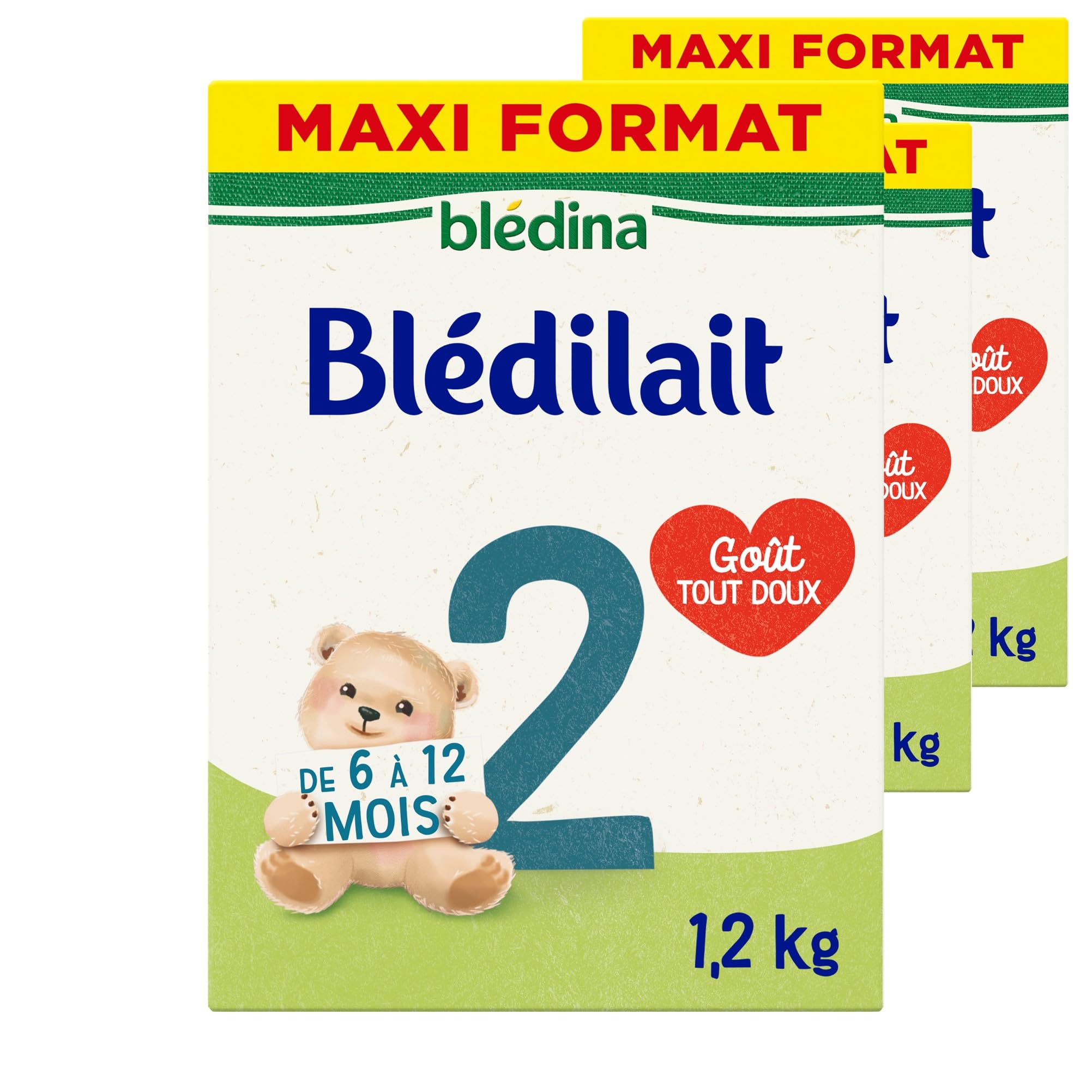 Blédina Blédilait 2, Baby Milk Powder, From 6 Months to 12 Months, 1.2kg (Box of 3) Blédina's nutrition experts have developed Blédilait 2nd stage: an infant milk formula that accompanies baby step by step, naturally, from 6 months to 12 months (1 year), as part of a diversified diet. Ingredients: Lactose (MILK), Vegetable oils (sunflower, coconut, rapeseed), Skimmed milk (MILK), Demineralized whey (MILK), Galacto-oligosaccharides (MILK), Whey concentrate (MILK), Cow's milk proteins (MILK), Fish oil (FISH), Fructo-oligosaccharides, Choline chloride, Emulsifier: soy lecithin (SOY), Inositol, L-Tryptophan, L-Carnitine, Antioxidant: fatty acid esters of ascorbic acid, Minerals (calcium and magnesium salts of orthophosphoric acid, potassium and magnesium chlorides, sodium and potassium citrates, iron, zinc, copper and manganese sulfates, potassium iodide, sodium selenite), Vitamins (A, B1, B2, B3, B5, B6, B8, B9, B12, C, D3, E, K1) P.when('A').execute(function(A) { A.on('a:expander:toggle_description:toggle:collapse', function(data) { window.scroll(0, data.expander. expander[0].offsetTop-100) }) }) Instructions for Use: It is important to carefully follow the instructions on the box to avoid risks to your baby's health. Prepare the bottle just before feeding. Use only the scoop provided in the box and cold bottled water, as recommended by your doctor for preparing the bottle. Shake the bottle horizontally and then vertically for about ten seconds, then warm it. It is recommended to consume the bottle within half an hour. After feeding, discard any remaining formula without hesitation. Safety Warning Important Notice: Breast milk is the ideal and natural food for every infant. However, if you cannot or do not wish to breastfeed, your healthcare professional will advise you on an infant formula that meets your child's specific nutritional needs. This product cannot be used as a substitute for breast milk during the first 6 months of life. It is suitable for your infant from 6 months onwards as part of a varied diet. Do not change formulas without consulting your doctor. They will also advise you on introducing complementary foods. See more3 packs of Blédilait 2 Infant Milk Powder, 1.2 kg each. Each pack contains two 600g sachets and a measuring scoop. Contains vitamin D , necessary for the normal growth and bone development of your baby, and FOS GOS fibers, whose structure is inspired by the oligosaccharides found in breast milk. Infant milk with DHA (Omega 3) and vitamins A and C , which contribute to the proper functioning of your baby's immune system ( In accordance with regulations). The Blédilait 2nd stage formula is a baby milk formula that helps meet the specific nutritional needs of babies, with: New formula: Blédilait 2 powdered milk: for babies from 6 to 12 months.Description du produit Blédina Blédilait 2, Lait en Poudre pour Bébé, De 6 Mois à 12 Mois, 1,2kg (Boîtex3) Les experts en nutrition de Blédina ont développé Blédilait 2ème âge : une formule de lait infantile qui accompagne bébé pas à pas, tout naturellement, de ses 6 mois jusqu'à ses 12 mois (1 an), dans le cadre d'une alimentation diversifiée. Ingrédients Lactose (LAIT), Huiles vegetales (tournesol, coprah, colza), Lait ecreme (LAIT), Lactoserum demineralise (LAIT), Galacto-oligosaccharides (LAIT), Lactoserum concentre (LAIT), Proteines de lait de vache (LAIT), Huile de poisson (POISSON), Fructo-oligosaccharides, Chlorure de choline, Emulsifiant lecithine de soja (SOJA), Inositol, L-Tryptophane, L-Carnitine, Antioxydant esters d'acides gras de l'acide ascorbique, Mineraux (sels de calcium et de magnesium de l'acide orthophosphorique, chlorures de potassium et de magnesium, citrates de sodium et de potassium, sulfates de fer, de zinc, de cuivre et de manganese, iodure de potassium, selenite de sodium), Vitamines (A, B1, B2, B3, B5, B6, B8, B9, B12, C, D3, E, K1) P.when('A').execute(function(A) { A.on('a:expander:toggle_description:toggle:collapse', function(data) { window.scroll(0, data.expander. expander[0].offsetTop-100) }) }) Mode d'emploi Il est important de bien respecter les instructions présentes sur la boîte afin d'éviter des risques pour la santé de votre bébé. Préparer le biberon juste avant le repas. Utiliser exclusivement la mesurette contenue dans la boîte et de l'eau froide en bouteille, conseillée par votre médecin pour la préparation du biberon. Agiter le biberon horizontalement puis verticalement pendant une dizaine de secondes puis faites tiédir. Il est recommandé de consommer le biberon dans la demi-heure. Après la tétée, jeter le reste du biberon sans hésiter. Avertissement De Sûreté Avis Important : Le lait maternel est, pour chaque nourrisson, l'aliment idéal et naturel. Toutefois, si vous ne pouvez pas ou ne souhaitez pas allaiter, le Corps Médical vous conseillera une préparation infantile répondant aux besoins nutritionnels spécifiques de votre enfant. Ce produit ne peut pas être utilisé comme substitut du lait maternel pendant les 6 premiers mois de vie. Il convient à votre nourrisson dès 6 mois dans le cadre d'une alimentation diversifiée. N'en changez pas sans demander l'avis de votre médecin. Il vous conseillera aussi sur l'introduction d'aliments complémentaires. Voir plus3 packs de Lait en Poudre pour Bebe Blédilait 2 de 1,2 kg. Chaque pack contient 2 sachets de 600g ainsi qu'une mesurette. De la vitamine D nécessaire à la croissance et au développement osseux normaux de bebe des fibres FOS GOS dont la structure est inspirée des oligosaccharides présents dans le lait maternel. Lait infantile avec du DHA (Omega 3) des vitamines A C qui contribuent au bon fonctionnement du système immunitaire ( Conformément à la réglementation) de bebe. La formule Blédilait 2ème âge est une Formule de Lait pour Bébé qui contribue à répondre aux besoins nutritionnels spécifiques du bébé, avec :. Nouvelle formule: Lait en poudre Blédilait