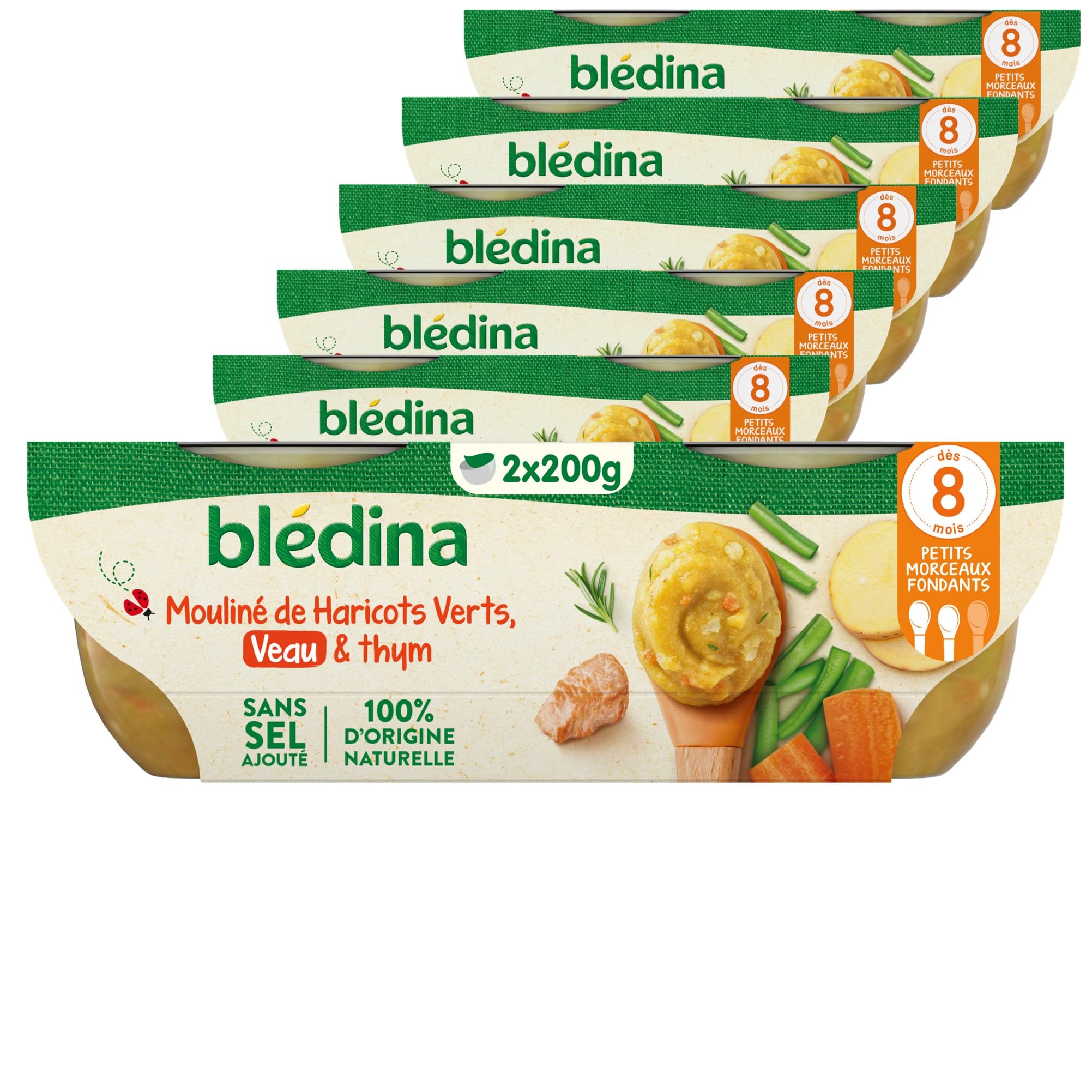 SANS COUVERCLE : En 2024, Blédina franchit une nouvelle étape dans la mise en œuvre de ses engagements écologiques et supprime les couvercles¹ à usage unique ¹Sur les Bols Blédina (midi soir) 2x200g, sur la base des projections de vente 2024?. UN BOL PRATIQUE : Un bol solide qui résiste aux chocs, une forme arrondie qui facilite la prise en main et la dégustation car facile à racler. SANS SEL AJOUTÉ et des recettes toujours aussi délicieuses, sans compromis sur le goût Des petits plats cuisinés, avec des épices et des herbes pour sublimer le goût et surprendre les gourmands les plus exigeants. DÈS 8 MOIS : La texture de nos petits plats évolue au fur et à mesure que bébé grandit Dès 8 mois, faites découvrir à bébé la sensation de petits morceaux fondants. REPAS COMPLETS BÉBÉ MIDI : 12 Bols Mouliné de Haricots Verts, Veau thym.