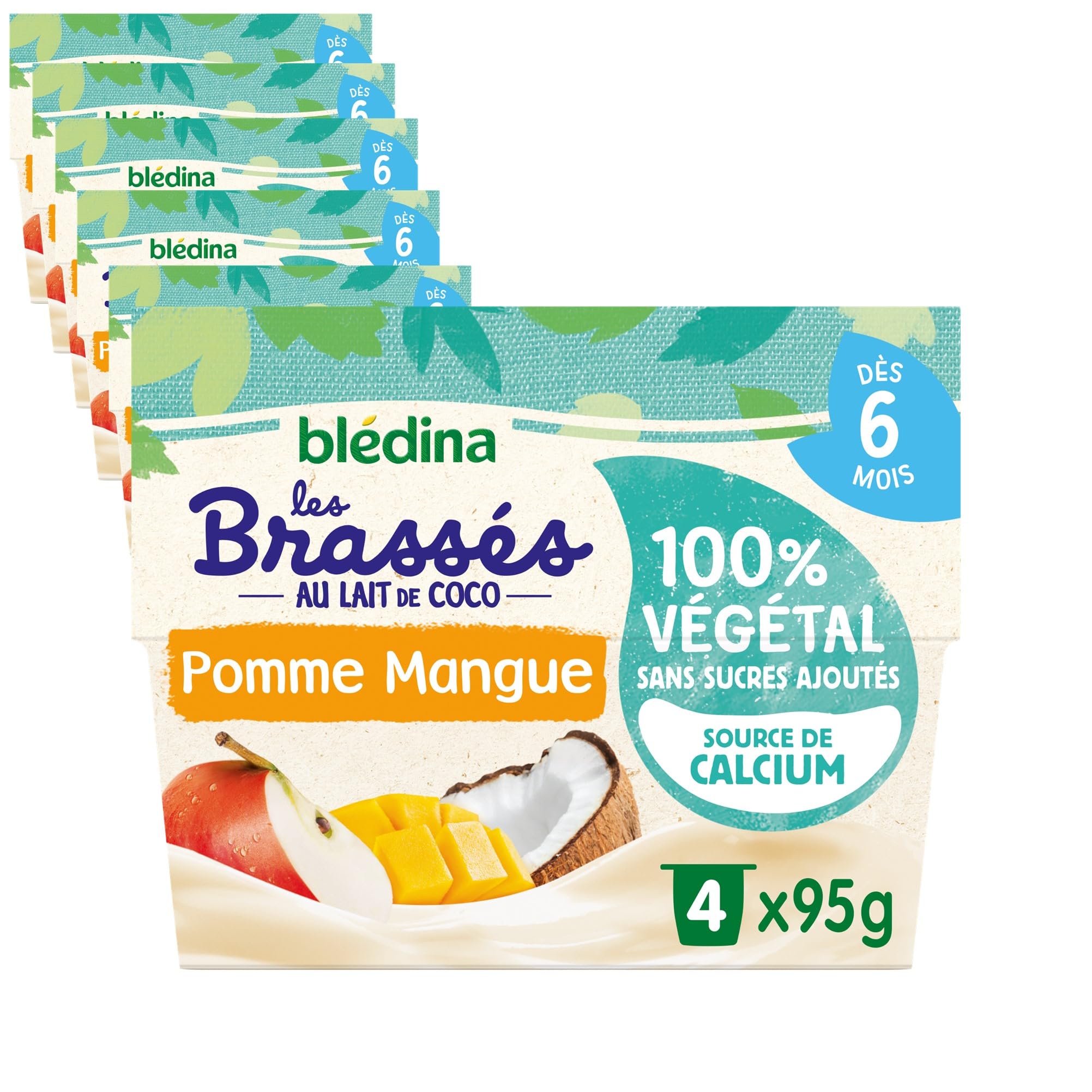 : BLEDINA Les Brassés, 100 Plant-Based Yogurt, Coconut Milk Mango, From 6 Months, 4 x 95g (6-Pack) Welcome the newest members of the Blédina 100 Plant-Based family! Blédina's mission? To make your baby a champion of varied nutrition! We firmly believe that eating a little bit of everything lays the right foundation for today and tomorrow. Variety is the spice of life! These 100 plant-based yogurts are delicious dessert recipes for babies, perfectly adapted to continue stimulating their taste buds and curiosity. The added bonus? They're also suitable for children allergic to cow's milk protein. And guess what? Our 100 plant-based yogurts are lovingly prepared by men and women passionate about good food. 1In accordance with infant food regulations. Baby plant-based dessert 6 months. Ingredients: Apples 60.0 - Coconut milk 15.0 (coconut extract, water) - Water - Mango puree 10.0 - Modified corn starch - Calcium citrate - Natural flavorings - Acidity regulator: Citric acid - Antioxidant: Ascorbic acid. P.when('A').execute(function(A) { A.on('a:expander:toggle_description:toggle:collapse', function(data) { window.scroll(0, data.expander. expander[0].offsetTop-100) }) }) Instructions for use: Consume immediately after opening Do not add sugar Do not consume the remaining product. Safety Warning: Always read the information, warnings, and directions for use on the label or packaging before using or consuming a product. See moreBlédina Baby Plant-Based Smoothie from 6 Months, Contains 24 x 95g Pots, Apple Mango. A new, smoother texture for baby food, perfect for delighting babies from 6 months. Suitable for children allergic to cow's milk protein. 100 plant-based baby food, Source of calcium, No animal protein, No pesticide residues (levels below 0.000001 in accordance with infant food regulations). Blédina plant-based dessert for babies from 6 months, Preservative-free recipe in accordance with infant food regulations, No added sugar. Specially adapted plant-based smoothies for babies from 6 months for lunch, afternoon snack, or dinner, with a creamy texture.Description du produit BLEDINA Les Brassés, Yaourt 100 Végétal, Lait de Coco Mangue, Dès 6 Mois, 4x95g (Packx6) Dites bienvenue aux petits derniers de la famille blédina 100 VEGETAL La mission blédina ? Faire de bébé le champion de l'alimentation diversifiée ! En effet, nous sommes convaincus que c'est en mangeant un peu de tout que l'on pose les bonnes bases pour aujourd'hui et pour demain. Varier les plaisirs, ça a du bon ! Ces brassés 100 VEGETAL, ce sont de délicieuses recettes de dessert pour bébé adaptées à bébé1 pour continuer à éveiller ses papilles et sa curiosité. Le petit ? Convient également aux enfants allergiques aux protéines de lait de vache. Et vous savez quoi ? Nos brassés 100 végétal sont préparées avec amour par des femmes et des hommes passionnés du bien manger. 1Conformément à la règlementation de l'alimentation infantile Dessert végétal bébé 6 mois Ingrédients Pommes 60,0 - Lait de coco 15,0 (extrait de noix de coco, eau) - Eau - Purée de mangues 10,0 - Amidon transformé de maïs - citrate de calcium - Arômes naturels - Correcteur d'acidité : Acide citrique - Antioxydant : Acide ascorbique P.when('A').execute(function(A) { A.on('a:expander:toggle_description:toggle:collapse', function(data) { window.scroll(0, data.expander. expander[0].offsetTop-100) }) }) Mode d'emploi A consommer dès l'ouverture Ne pas ajouter de sucre Ne pas consommer le produit restant Avertissement De Sûreté Veillez à toujours prendre connaissance des informations, avertissements et conditions d'utilisation figurant sur l'étiquette ou l'emballage avant d'utiliser un produit ou de le consommer. Voir plusBrassé végétal bébé dès 6 mois Blédina, Contient 24 pots de 95 g, Pomme Mangue. Une nouvelle texture de brassé pour bébé, plus onctueuse pour régaler bébé dès 6 mois, Convient aux enfants allergiques aux protéines de lait de vache. Repas bébé 100 pourcentage végétal, Source de calcium, Sans protéines d'origine animale, Sans résidus de pesticides Taux inférieurs à 0,000001 pourcentage conformément aux règles de l'alimentation infantile. Dessert végétal pour bébé Blédina dès 6 mois, Recette sans conservateur conformément à la réglementation de l'alimentation infantile, Ne pas ajouter de sucre. Des brassés végétaux spécialement adaptés à bébé dès 6 mois pour le déjeuner, goûter ou dîner, à la texture onctueuse.Blédina - Brassés 100 Végétal - Lait de Coco pomme Mangue - Dès 6 Mois - 6 x 380g
