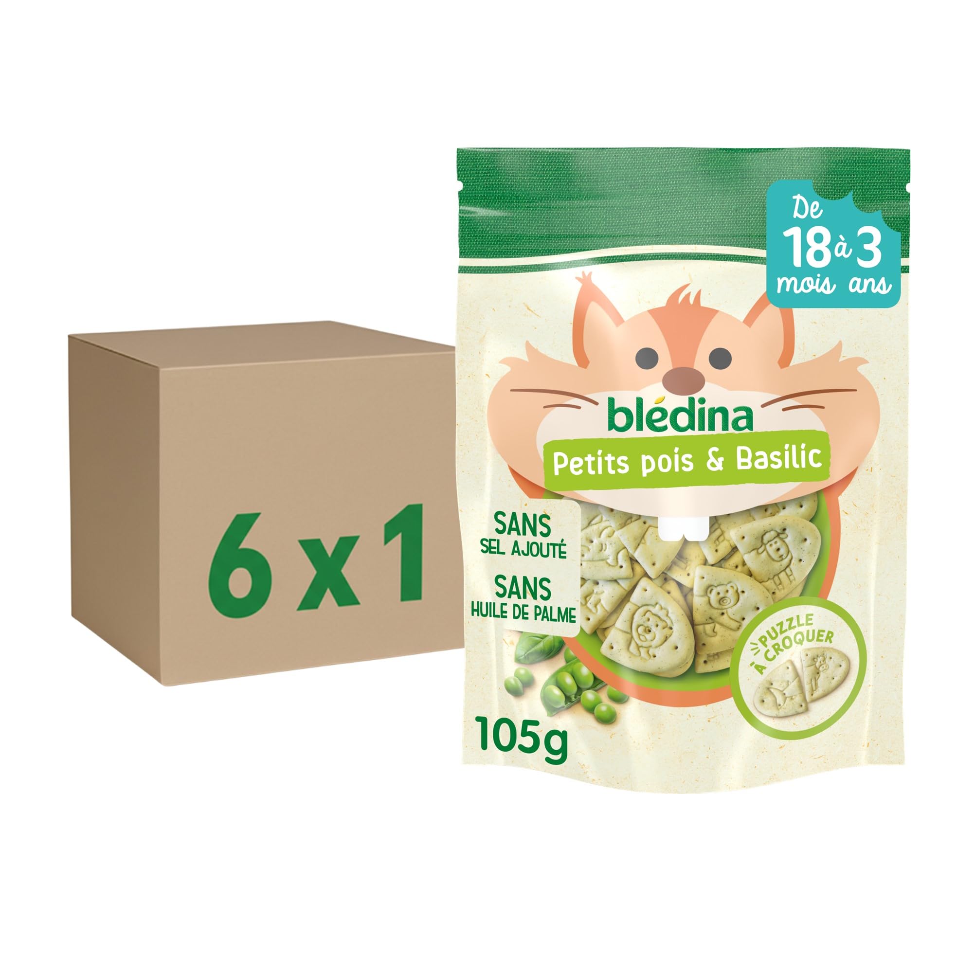 Blédina Crousti À Dévorer, Dès 18 Mois, Biscuit Bébé Texture Cracker Croquante et Forme Puzzle Ludique, Recette Céréales Sans Sel Ajouté pour Repas Bébé, Petits Pois et Basilic, Lot de 6x105g