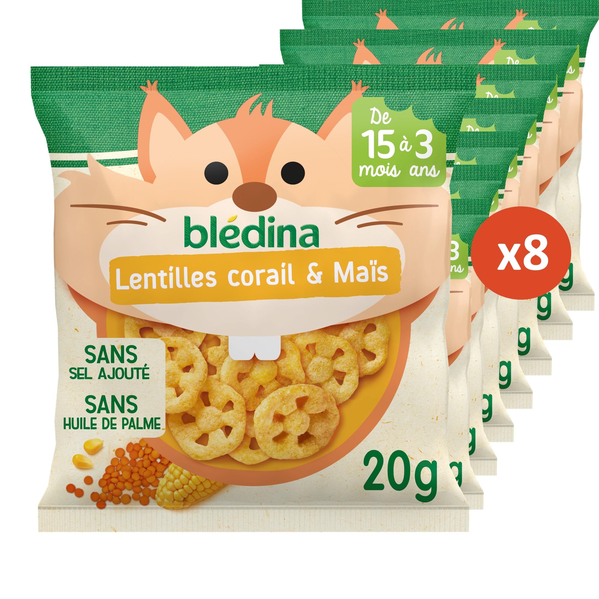 BLÉDINA - Crousti à Dévorer - Maïs et lentilles Corail - Sans Gluten et Sans Sel Ajouté - dès 15 Mois - 8 x 20 g Mais Lentilles corail