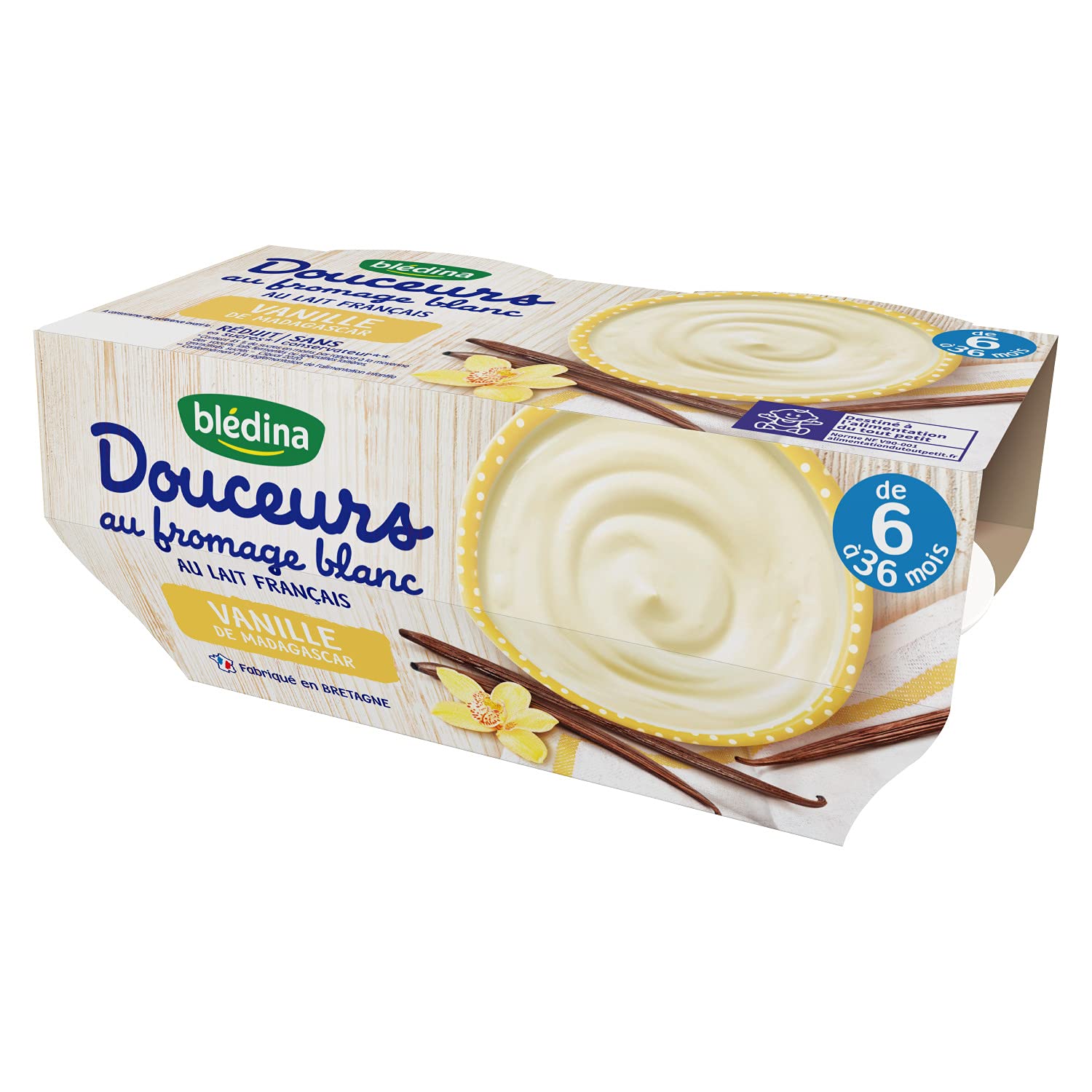 : Blédina, Baby Fromage Blanc Dessert, From 6 Months, Madagascar Vanilla, 1 x (4 x 100g) Discover the "My Douceurs" range of baby fromage blanc, made in Brittany: delicious recipes with a smooth texture to offer your baby indulgent moments from 6 to 8 months. "My Douceurs" includes: good milk and fromage blanc from Western France. These dairy desserts for babies are free of added sugars and preservatives . 45 less sugar compared to the average of sweetened fruit yogurts, fermented milks, or dairy specialties - Cliqual, 2017. In accordance with regulations. Reduced sugar content. For the Strawberry and Mirabelle de Lorraine recipes, there is 45 less sugar compared to the average of sweetened fruit yogurts, fermented milks, or dairy specialties(1). For the Plain with Cane Sugar recipe: 38 less sugar compared to the average plain, sweetened yogurt, fermented milk, or dairy specialty(1). (1) Ciqual 2017 Made in Brittany, with good milk and fromage blanc collected in Western France. We've put Western France into our recipes! Real fruit puree(2) Delicious strawberries and mirabelle plums from Lorraine for baby's greatest pleasure. (2) except for the Plain with Cane Sugar recipe. A smooth texture: A little thickener, but as little as possible. Carob, a plant-based thickener, combined with starch, helps maintain a lovely smooth texture throughout the product's shelf life. So baby won't make a mess! The Fromage Blanc range is perfect for baby's lunch, afternoon snack, and dinner! Ingredients: Whole milk 41 (MILK) - Water - Cottage cheese 12.5 (MILK) - Reconstituted skimmed milk 7 (MILK) - Sugar 4.5 - Starches - Cream (MILK) - Thickeners: locust bean gum, pectin - Acidifier: citric acid - Natural vanilla flavoring from Madagascar. Instructions: Do not add sugar. Discard any remaining product if not consumed. Safety Warning: Find our tips on baby's oral hygiene on our website bledina.com. See moreSoft, creamy yogurt dessert for babies from 6 months Madagascar Vanilla 1 pack containing four 100g cups. These French yogurt desserts contain real fruit puree (2), blended to create a smooth and delicious texture. Our dairy desserts for babies are made in Brittany, using good French milk and yogurt sourced from the Greater West region. These yogurt-based yogurt desserts for babies have a reduced sugar content and are preservative-free . Discover Blédina's soft yogurt desserts, delicious recipes with a smooth texture to offer your baby indulgent moments from 6 months.Description du produit Blédina, Dessert au fromage blanc pour bébé, Dès 6 Mois, Vanille de Madagascar, 1x(4x100 g) Découvrez les Douceurs au fromage blanc, fabriquées en Bretagne : de délicieuses recettes à la texture onctueuse pour offrir à bébé des moments gourmands dès 6 et 8 mois. Mes Douceurs c'est notamment : du bon lait et du fromage blanc du Grand Ouest. Ces desserts lactés pour bébé sont sans sucres ajoutés et sans conservateur 45 de sucres en moins par rapport à la moyenne des yaourts, laits fermentés ou spécialités laitières, aux fruits, sucrés - Cliqual, 2017 Conformément à la réglementation Teneur réduite en sucre Pour les recettes Fraise et Mirabelle de Lorraine, c'est 45 de sucres en moins par rapport à la moyenne des yaourts, laits fermentés ou spécialités laitières, aux fruits, sucrés(1). Pour la recette Nature au sucre de canne : 38 de sucres en moins par rapport à la moyenne des yaourts, laits fermentés ou spécialités laitières, nature, sucrés(1). (1)Ciqual 2017 Fabriqué en Bretagne, avec du bon lait et du fromage blanc collectés dans le Grand Ouest On a mis le Grand Ouest dans nos recettes ! De la vraie purée de fruits(2) De délicieuses fraises et mirabelles de Lorraine pour le plus grand plaisir de bébé. (2) à l'exception de la recette Nature sucre de canne Une texture onctueuse : Un peu d'épaississant, mais le moins possible La caroube, épaississant d'origine végétale, associée à de l'amidon, permet de maintenir une belle texture onctueuse tout au long de la durée de vie du produit. Ainsi bébé ne s'en mettra pas partout ! La gamme Douceurs au fromage blanc est adaptée au déjeuner, goûter et dîner de bébé ! Ingrédients Lait entier 41 (LAIT) - Eau - Fromage blanc 12,5 (LAIT) - Lait écrémé reconstitué 7 (LAIT) - Sucre 4,5 - Amidons - Crème (LAIT) - Epaississants : farine de graine de caroube, pectine - Acidifiant : acide citrique - Arôme naturel de vanille de Madagascar P.when('A').execute(function(A) { A.on('a:expander:toggle_description:toggle:collapse', function(data) { window.scroll(0, data.expander. expander[0].offsetTop-100) }) }) Mode d'emploi Ne pas ajouter de sucre. Jeter le reste du produit si non consommé. Avertissement De Sûreté Retrouvez nos conseils sur l'hygiène bucco-dentaire de bébé sur notre site bledina.com. Voir plusDouceur au fromage blanc pour bébé dès 6 mois Vanille de Madagascar 1 pack contenant chacun 4 coupelles de 100 g chacune. Ces desserts au fromage blanc français contiennent de la vraie purée de fruits (2), mixée pour obtenir une texture onctueuse et gourmande. Nos desserts lactés pour bébé sont fabriqués en Bretagne, avec du bon lait français et du fromage blanc collectés dans le Grand-Ouest. Les recettes de ces lactés au fromage blanc pour bébé ont une teneur réduite en sucre et sont sans conservateur . Découvrez les douceurs au fromage blanc de Blédina, de délicieuses recettes à la texture onctueuse pour offrir à bébé des moments gourmands dès 6 mois.Blédina, Dessert au fromage blanc pour bébé, Dès 6 Mois, Vanille de Madagascar, 4x100g (Lot de 6)