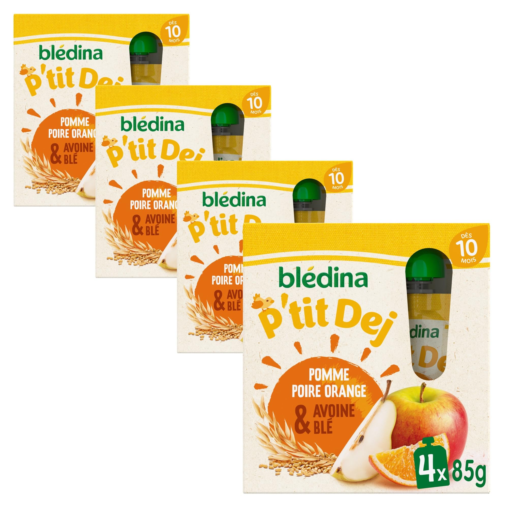 PRACTICAL: These convenient baby pouches are perfect for on-the-go use. They can be stored at room temperature and are easy to take anywhere. NO ADDED SUGAR: Contains naturally occurring sugars, is rich in fiber and vitamin C, and has no pesticide residues: levels below 0.000001 , in accordance with infant food regulations. FROM 10 MONTHS: This recipe is suitable for babies from 10 months old, as a complement to their usual milk. FOR BREAKFAST: At Blédina, we're here to help with our P'tit Dej pouches made with fruit and cereals for a breakfast tailored to your baby. For busy mornings, discover our new delicious Apple, Pear, Orange, and Oat Wheat recipe to delight your little one.