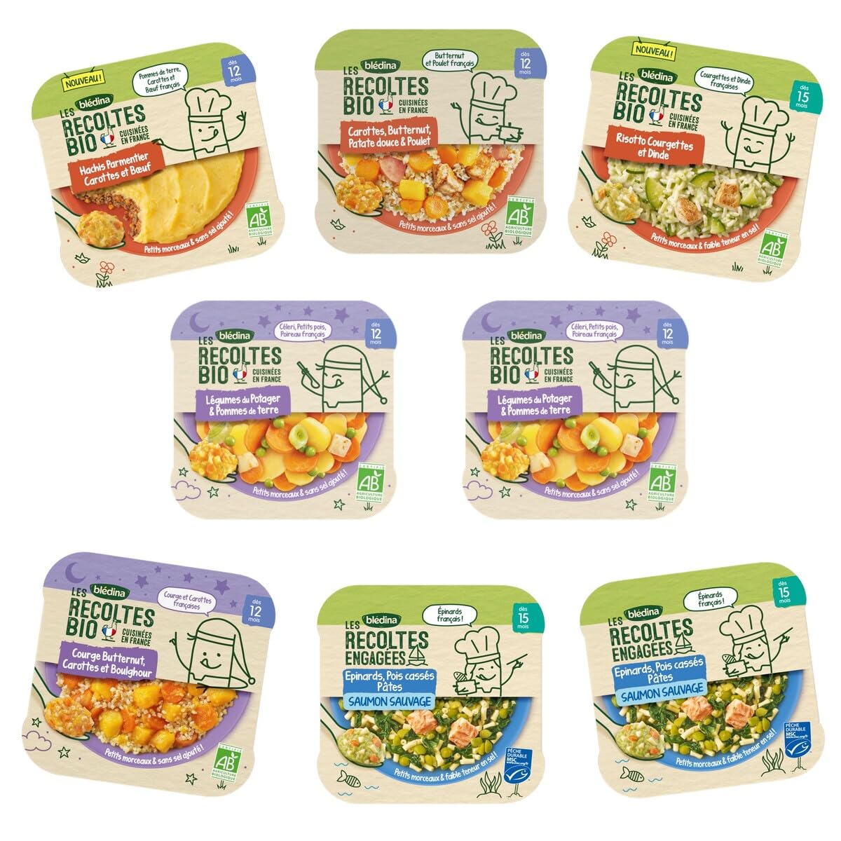 BLÉDINA: For more than 110 years, Blédina has been committed to providing health through nutrition during the first 1000 days of baby's life. With the desire to pass on good eating habits to all babies. Blédina is a B-Corp certified company and is committed to meeting social and environmental criteria. INGREDIENTS Organic Harvests Vegetables from the Garden Potatoes: Water - Potato 22.1 - Carrots 17.3 - Parsnips 15.0 - Peas 5.33 - Leek 4.67 - Celery (CELERY) - Onion - Waxy corn starch - Vegetable oils (rapeseed, sunflower) - Chives - Garlic powder - Thyme - Black pepper - Bay leaf - Cloves - Products from organic farming Les Récoltes Bio Butternut, Carrots, Sweet Potatoes, Bulgur and Chicken: Water - Carrots 22.7 - Butternut 14.5 - Cooked bulgur 13.2 (GLUTEN) - Chicken meat (origin: France) 8.00 - Sweet potatoes 7.00 - Waxy corn starch - Vegetable oils (rapeseed, sunflower) - Parsley - Onion - Thyme - Bay leaf - Products from organic farming Les Récoltes Bio Risotto Zucchini Turkey: Cooking water - Cooked rice 19.0 - Zucchini 16.9 - Turkey meat 8.00 - Carrots - Peas - Onion - Potato - Corn starch - Mushrooms - Spinach - Shallot powder - Extra virgin olive oil - Vegetable oils (rapeseed, sunflower) - Salt - Chives - Thyme - Garlic powder - Bay leaf . Products from organic farming Les Récoltes Bio Hachis Parmentier Carrots Beef: Carrots 24.0 - Cooking water - Potato flakes 17.2 - Potato 12.0 - Beef (origin: France) 8.00 - Parsnip - Onion - Waxy corn starch - Celeriac (CELERY) - Vegetable oils (rapeseed, sunflower) - Parsley - Black pepper - Nutmeg . Products from organic farming May contain traces of GLUTEN Les Récoltes Bio Nutmeg - Cinnamon - Products from organic farming Les Récoltes Bio Spinach Salmon Pasta: Cooking water - Spinach 12.0 - carrots - Cooked pasta 9.00 (Durum wheat semolina (GLUTEN), Powdered egg white (EGG)) - Chum and or Pacific pink salmon in variable proportions 8.00 (FISH) - Peas broken 6.00 - Peas 5.00 - parsnips - Green beans 3.70 - Corn starch - onion - Vegetable oils (rapeseed, sunflower) - Celeriac (CELERY) - Salt - Black pepper - nutmeg - Products from organic farming. May contain traces of SOY and MUSTARD. DIRECTIONS FOR USE Before opening, store at room temperature in a clean, dry place. SAFETY WARNING Not Applicable ORGANIC DISHES: designed to kick-start the great adventure of diversifying food with babies from 12 months old. A HELPING HAND FOR FARMERS to develop French organic food, a support program set up to help French farmers during their conversion to organic. 80 INGREDIENTS OF FRENCH ORIGIN: Delicious ingredients, French as much as possible, our recipes are cooked in France and we favor French ingredients. 6 RECIPES: Butternut Squash, Carrots and Bulgur Garden Vegetables and Potatoes Parmentier Hash, Carrot and Beef Butternut Carrots, Sweet Potato and Chicken Zucchini and Turkey Risotto Spinach, Split Peas, Pasta and Wild Salmon. BABY PLATES: Discover our Blédina Les Récoltes Bio lunch and dinner pack for 12 and 15 months, in a new format of 8 plates, small organic dishes to continue to delight baby, with small pieces. BLÉDINA : Depuis plus de 110ans, Blédina s'engage à apporter la santé par l'alimentation pendant les 1000 premiers jours de vie de bébé. Avec l'envie de transmettre les bonnes habitudes alimentaires à tous les bébés. Blédina est une entreprise certifiée B-Corp est s'engage à répondre aux critères sociaux et environnementaux. INGRÉDIENTS Les Récoltes Bio Légumes du Potager Pommes de terre : Eau - Pomme de terre 22,1 - Carottes 17,3 - Panais 15,0 - Petits pois 5,33 - poireau 4,67 - céleri (CELERI) - Oignon - Amidon de maïs cireux - Huiles végétales (colza, tournesol) - Ciboulette - Ail en poudre - Thym - Poivre noir - Laurier - Clou de girofle - Produits issus de l'agriculture biologique Les Récoltes Bio Butternut, Carottes, Patates Douces, Boulghour et Poulet : Eau - Carottes 22,7 - Butternut 14,5 - Boulghour cuit 13,2 (GLUTEN) - Viande de poulet (origine: France) 8,00 - Patates douces 7,00 - Amidon de maïs cireux - Huiles végétales (colza, tournesol) - Persil - Oignon - Thym - Laurier - Produits issus de l'agriculture biologique Les Récoltes Bio Risotto Courgettes Dinde : Eau de cuisson - Riz cuit 19,0 - Courgettes 16,9 - Viande de dinde 8,00 - Carottes - Petits pois - Oignon - Pomme de terre - Amidon de maïs - Champignons - Epinards - Echalote en poudre - Huile d'olive vierge extra - Huiles végétale s (colza, tournesol) - Sel - Ciboulette - Thym - Ail en poudre - Laurier . Produits issus de l'agriculture biologique Les Récoltes Bio Hachis Parmentier Carottes Boeuf : Carottes 24,0 - Eau de cuisson - Flocons de pomme de terre 17,2 - Pomme de terre 12,0 - Viande de boeuf (origine : France) 8,00 - Panais - Oignon - Amidon de maïs cireux - Céleri rave (CELERI) - Huiles végétales (colza, tournesol) - Persil - Poivre noir - Muscade . Produits issus de l'agriculture biologique Peut contenir des traces de GLUTEN Les Récoltes Bio X8 Courge Butternut, Carottes et Boulghour : Eau de cuisson - Butternut 25,0 - Carottes 20,0 - Boulghour (GLUTEN) 15,0 - Pomme de terre - Oignon - Huiles végétales (colza, tournesol) - Amidon de maïs - Ail en poudre - Muscade - Cannelle - Produits issus de l'agriculture biologique Les Récoltes Bio Epinards Saumon Pâtes : Eau de cuisson - Epinards 12,0 - des carottes - Pâtes cuites 9,00 (Semoule de blé dur (GLUTEN), Blanc d'Oeuf en poudre (OEUF)) - Saumon kéta et ou rose du Pacifique en proportion variable 8,00 (POISSON) - Pois cassés 6,00 - Petits pois 5 ,00 - du panais - Haricots verts 3,70 - Amidon de maïs - de l'oignon - Huiles végétales (colza, tournesol) - Céleri rave (CELERI) - Sel - Poivre noir - de la muscade - Produits issus de l'agriculture biologique. Peut contenir des traces de SOJA et MOUTARDE. MODE D'EMPLOI Avant ouverture, conserver à température ambiante dans un endroit propre et sec. AVERTISSEMENT DE SÛRETÉ Non Applicable PLATS BIO : élaboré