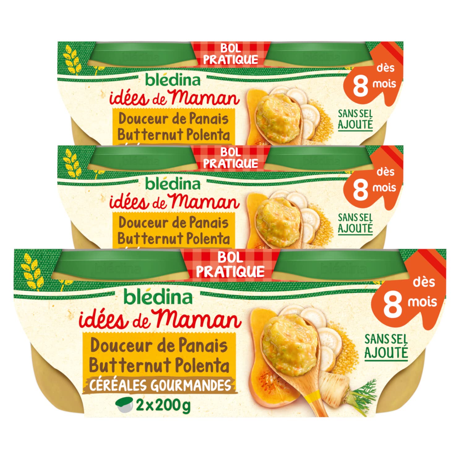 Blédina, Mom's Ideas, Baby Meals from 12 Months, Parsnips, Butternut, Polenta, 6x200g At Blédina, we work hand in hand with farmers, a cook and nutritionists, all passionate, to develop delicious recipes inspired by homemade with a unique and scalable texture and all in a resealable bowl to carry everywhere to be as close as possible to you, and recyclable !? A new practical and recyclable pack, without added salt but still just as good, with more ingredients of 100 natural origin and a texture that is still unique, close to homemade! Mom's Ideas are so good that Blédina was inspired to prepare delicious recipes with ingredients of 100 natural origin! Blédina Idées de Maman from 12 months are vegetable and meat purees, tasty and inspired by homemade. With their milled texture, its pieces and its precisely dosed touch of cream, you can accompany baby's meal peacefully on the path of textures and flavors! Bledina Idees de Maman dishes are cooked in Brive-la-Gaillarde (Corrèze) and are made without flavorings or preservatives but with a lot of love! Mom's idea dishes are suitable for lunch and dinner for little ones! Did you know? The texture of our little dishes changes as baby grows: From 6 months, discover the first sensations of a mouliné texture From 8 months, our little dishes are decorated with very small pieces At 12 months (1 year), real pieces melt in the mouth, at 15 months, no more small pieces. ? From gourmet vegetable and cereal recipes to complete meals with the right amount of protein (100 French meat and wild fish) for lunch, nearly 30 recipes to discover to revive baby's taste buds! Ideas from mom cooking for you also gluten-free, allergen-free, dairy-free and veggie-free dishes to help babies who encounter digestive difficulties. ? According to local sorting instructions and everywhere in France from 2022! INGREDIENTS Tasty parsnips 25.0 - pumpkin 18.7 - cooking water - cornmeal 10.5 - skimmed milk reconstituted from powdered milk 10.0 (MILK) - carrots - celery (CELERY) - onions - potatoes - corn starch - a drizzle of vegetable oils (rapeseed, sunflower) - cream (MILK) - a sprig of parsley - a pinch of turmeric - a pinch of cumin. DIRECTIONS FOR USE Preparation tips: reheat in a bain-marie or in the microwave. Detailed instructions for use under the bowl lid. Add a drizzle of oil but no salt. SAFETY WARNING Packaged in a protective atmosphere Baby food from 12 months Ideas from Mom 6 portions of 200g Parsnip, Butternut, Polenta. A solid bowl that resists shocks, a rounded shape that makes it easy to hold and eat because it is easy to scrape! Resealable, easy to carry everywhere! New covering lid Recyclable packaging for baby's meal from 12 months According to local sorting instructions and everywhere in France from 2022! Baby dish with ingredients of 100 natural origin, carefully selected then combined and simmered to make a recipe without pesticide residues, colorings or preservatives In accordance with regulations. From 12 months, to accompany baby at the family table, our baby bowls are low in salt. Baby meal 12 months combining vegetables and or starches ground with meat or fish and enhanced with a touch of herbs or spices Gentle steam cooking A unique baby meal texture. Blédina, Idées de Maman, Repas bébé dès 12 Mois, Panais, Butternut, Polenta, 6x200g Chez Blédina, nous travaillons main dans la main avec des agriculteurs, un cuisinier et des nutritionnistes, tous passionnés, afin d'élaborer de délicieuses recettes inspirées du fait maison à la texture unique et évolutive et le tout dans un bol refermable à transporter partout pour être au plus près de vous, et recyclable !? Un nouveau pack pratique et recyclable, sans sel ajouté mais toujours aussi bon, avec plus d'ingrédients 100 d'origine naturelle et une texture toujours unique, proche du fait maison ! Les Idées de maman sont si bonnes que Blédina s'en est inspiré pour préparer de délicieuses recettes avec des ingrédients 100 d'origine naturelle ! Blédina Idées de Maman dès 12 mois ce sont des purées de légumes et viandes, savoureuses et inspirée du fait maison. Avec leur texture moulinée, ses morceaux et sa touche de crème justement dosée, vous accompagnez sereinement le repas de bébé sur le chemin des textures et des saveurs ! Les plats bledina Idees de Maman sont cuisinées à Brive-la-Gaillarde (Corrèze) et sont réalisés ans arômes ni conservateurs mais avec beaucoup d'amour ! Les plats idée de maman conviennent pour le déjeuner et le diner des petits petits ! Le saviez-vous ? La texture de nos petits plats évolue au fur et à mesure que bébé grandit : Dès 6 mois, découvrez les 1ers sensations d'une texture moulinée Dès 8 mois, nos petits plats sont agrémentées de tout petits morceaux A 12 mois (1 an), des vrais morceaux fondants en bouche, à 15 mois, plus de petits morceaux. ? Des recettes de légumes et céréales gourmandes jusqu'aux aux repas complets avec la juste quantité de protéines (viandes 100 française et poisson sauvage) pour le midi, près de 30 recettes à découvrir pour raviver les papilles de bébé ! Idées de maman cuisine pour vous des plats également sans gluten, sans allergène, sans lait et veggie pour aider les bébés qui rencontrent des difficultés digestives. ? Selon les consignes de tri locales et partout en France dès 2022 ! INGRÉDIENTS De savoureux panais 25,0 - du potiron 18,7 - de l'eau de cuisson - de la semoule de maïs 10,5 - du lait écrémé reconstitué à base de lait en poudre 10,0 (LAIT) - des carottes - du céleri (CELERI) - des oignons - des pommes de terre - de l'amidon de maïs - un filet d'huiles végétales (colza, tournesol) - de la crème (LAIT) - un brin de persil - une pincée de curcuma - une pointe de cumin. MODE D'EMPLOI Conseils de préparation? : réchauffer au bain-marie ou au micro-ondes. Mode d'emploi détaillé sous le couvercle du bol. Ajouter un filet d'huile mais pas de sel. AVERTISSE