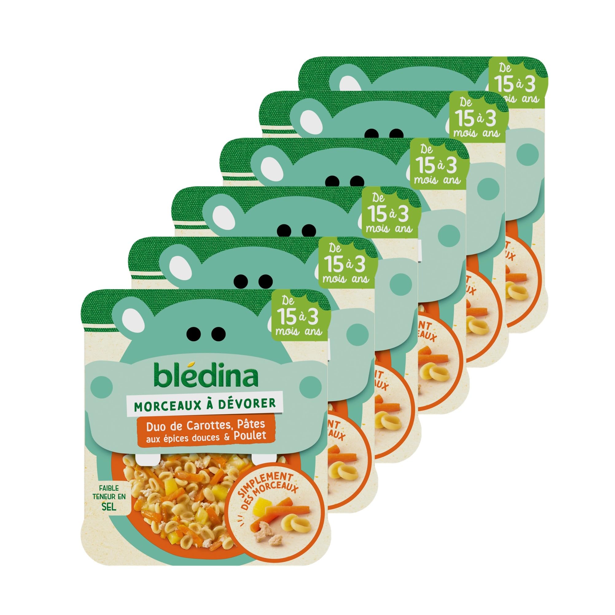 Is baby ready? Offer him this Little Baby Dish - only if he: - Sits up and moves around on his own - Already has two teeth - Eats dishes with more or less soft pieces - Eats a crust of bread INSTRUCTIONS FOR USE Before opening, store at room temperature in a clean, dry place. After opening, cover the product and store it for a maximum of 24 hours in the refrigerator. SAFETY WARNING Always read the information, warnings and conditions of use on the label or packaging before using or consuming a product. Big pieces can mean a few fibers or small vegetable skins, for example, just like for adults! Help him recognize all the good ingredients on his plate! A complete lunchtime dish made with perfectly recognizable ingredients to gradually teach your baby to eat like a grown-up. Small Baby Dishes - Duo of Carrots, Pasta with Sweet Spices Chicken. Discover the small Blédina Morceaux à Dévorer dishes from 15 months to 3 years. Bébé est-il prêt ? Proposez lui ce Petit Plat Bébé - uniquement s'il : - Se tient assis et se déplace tout seul - A déjà deux dents - Mange des plats avec des morceaux plus ou moins fondants - Mange un quignon de pain MODE D'EMPLOI Avant ouverture, à conserver à température ambiante dans un endroit propre et sec. Après ouverture, recouvrir le produit et le conserver 24 heures maximum au réfrigérateur. AVERTISSEMENT DE SÛRETÉ Veillez à toujours prendre connaissance des informations, avertissements et conditions d'utilisation figurant sur l'étiquette ou l'emballage avant d'utiliser un produit ou de le consommer. Qui dit gros morceaux peut dire quelques fibres ou petites peaux de légumes par exemple, comme pour les grands !. Aidez le à reconnaitre tous les bons ingrédients de son assiette !. Un plat complet pour le midi composé d'ingrédients parfaitement reconnaissables pour apprendre à votre bébé à manger progressivement comme un grand. Petits Plats Bébé - Duo de Carottes, Pâtes Aux Epices Douces Poulet. Découvrez les petits plats Blédina Morceaux à Dévorer de 15 mois à 3 ans.
