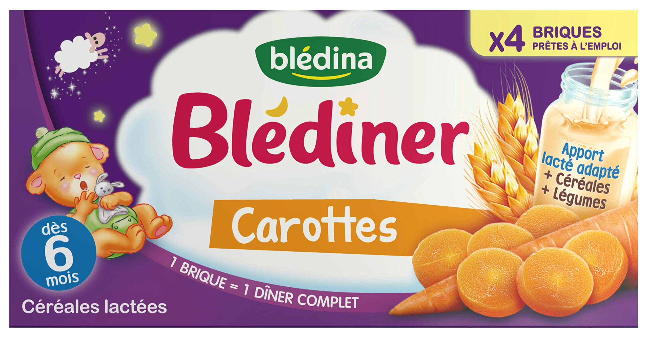 BLEDINER 4x250mL Carrots - Milk cereals from 6 months. To vary from your usual dinners, discover a range of tasty milk cereals adapted to baby's needs1 for dinner. BLEDINER Carrots is a tasty complete dinner for baby with an appropriate milk intake2, cereals and vegetables with a very mild taste! And all in a practical, ready-to-use format! 1 In accordance with infant nutrition regulations 2A suitable milk intake which helps cover baby's needs for calcium, iron and omega 3 (alpha-linolenic acid) INGREDIENTS WHEAT flour 70.3 , vegetable oils (palm, rapeseed), dried grated EMMENTAL 4 , sugar, glucosefructose syrup, salt, raising agent (ammonium hydrogen carbonate, sodium hydrogen carbonate, calcium phosphates), malted BARLEY flour, SESAME seeds 1.2 , whey powder (from MILK), dry yeast, poppy seeds 0.5 , emulsifier (SOY lecithin), gluten (WHEAT), flavor (contains CELERY), herbs and spices. MAY CONTAIN EGG, NUTS. DISCLAIMER Non-contractual photography. The above indications are given for information purposes. They are not necessarily exhaustive and cannot replace the information appearing on the product packaging which is the only authentic information, and to which you are invited to refer, particularly in the event of food intolerance. 79 mm. Ready-to-use bricks. Instructions on the brick. Drink warm or at room temperature. It is essential to respect baby's appetite never force them to finish their bottle. Do not add salt or sugar. As baby grows, don't hesitate to offer them Blédîner Milk Cereal in a sippy cup or a suitable glass. Find our advice on baby's oral hygiene on our website. Brick ready to use or to be consumed warm. Do not boil or heat the brick directly in the microwave. Do not add sugar. 100 mm. The 4 bricks of 250 ml. BLEDINER 4x250mL Carottes - Céréales lactées dès 6 mois. Pour varier de ses dîners habituels, découvrez une gamme de savoureuses céréales lactées adaptées aux besoins de bébé1 pour le dîner. BLEDINER Carottes, c'est un savoureux diner complet pour bébé avec un apport lacté adapté2, des céréales et des légumes au goût tout doux ! Et le tout dans un format pratique prêt à l'usage ! 1 Conformément à la réglementation de l'alimentation infantile 2Un apport lacté adapté qui participe à la couverture des besoins de bébé en calcium, fer et omega 3 (Acide alpha-linolénique) INGRÉDIENTS Farine de BLE 70,3 , huiles végétales (palme, colza), EMMENTAL râpé séché 4 , sucre, sirop de glucosefructose, sel, poudre à lever (carbonate acide d'ammonium, carbonate acide de sodium, phosphates de calcium), farine d'ORGE malté, graines de SÉSAME 1,2 , lactosérum en poudre (de LAIT), levure sèche, graines de pavot 0,5 , émulsifiant (lécithine de SOJA), gluten (de BLE), arôme (contient CÉLERI), aromates et épices. PEUT CONTENIR OEUF, FRUITS À COQUE. CLAUSE DE NON-GARANTIE Photographie non contractuelle. Les indications ci-dessus sont données à titre d'information. Elles ne sont pas forcément exhaustives et ne sauraient se substituer aux informations figurant sur l'emballage du produit qui font seules foi, et auxquelles vous êtes invités à vous reporter, notamment en cas d'intolérance alimentaire 79 mm. Briques prêtes à l'emploi. Mode d'emploi sur la brique. A boire tiède ou à température ambiante. Il est essentiel de respecter l'appétit de bébé, ne jamais le forcer à terminer son biberon. Ne pas ajouter de sel ni de sucre. Quand bébé grandit, n'hésitez pas à lui proposer Blédîner Céréales lactées dans une tasse à bec ou un verre adapté. Retrouvez nos conseils sur l'hygiène bucco-dentaire de bébé sur notre site internet. Brique prête à l'emploi ou à consommer tiède. Ne pas faire bouillir, ni chauffer la brique directement au four à micro-ondes. Ne pas ajouter de sucre. 100 mm. Les 4 briques de 250ml.
