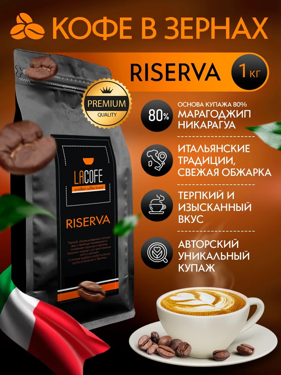 Зерновой кофе LACOFE RISERVA представляет собой купаж премиальных сортов арабики и робусты, где основой является премиальный сорт Марагоджип Никарагуа (80%): этот сорт отличается величиной кофейных зерен, они крупнее, чем зерна любых других сортов! Вкус кофе получается сбалансированным, терпким и густым с приятным послевкусием и сочетанием горчинки и кислинки. Состав купажа: основой купажа является Марагоджип Никарагуа (80%) с добавлением премиальной азиатской робусты (20%). Во вкусе легкая горчинка с нотами вина и чая. Напиток получается терпким, густым, но при этом достаточно мягким и бархатным, а добавление Индийской робусты придаёт смеси сладости карамели и орехов. Идеально подходит для любителей сбалансированного, насыщенного вкуса без потери полноты и плотности, а также для приготовления классического эспрессо, латте и капучино. Мы жарим и продаем вкусный, натуральный, свежеобжаренный кофе в зернах 1 кг из Бразилии, Вьетнама, Колубии, Индии, Никарагуа, Индонезии, а также авторские купажи из разных премиальных зерновых сортов арабики и робусты 1 кг. Наслаждайтесь свежеобжаренным кофе вместе с нами каждый день, открывая день бодрящим ароматом и приятным чарующим напитком, или в качестве подарка родным и близким! В нашем магазине Вы можете в любое время приобрести свежеобжаренный зерновой кофе 100% арабика или авторские купажи из смессей зерен премиальной арабики и робусты. Кофе в зернах 1кг из премиальных сортов Бразилии, Вьетнама, Колубии, Индии, Никарагуа, Индонезии, а также авторские купажи разных сортов кофе из нашего ассортимента - идеальный подарок для любителей кофе, а также вкусный подарок для ваших родных и близких.